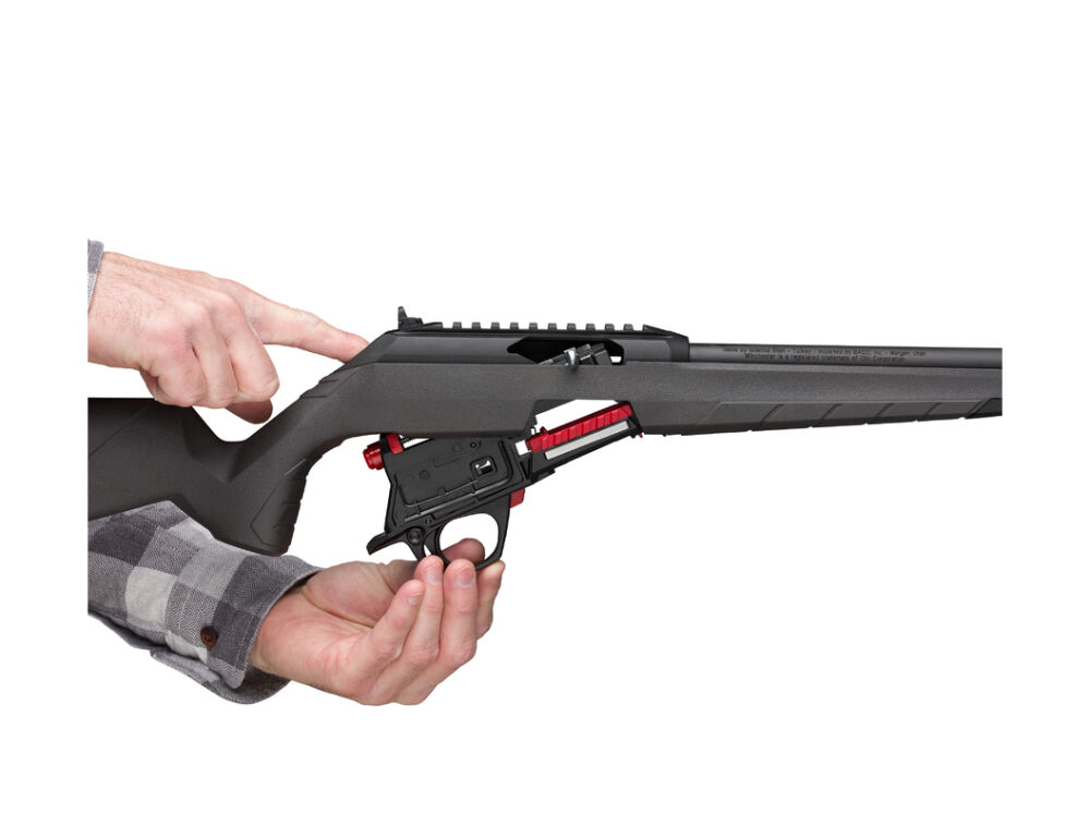 Der untere Teil des Gehäuses, zusammen mit dem Schloss und dem Abzugszüngel, kann leicht vom oberen Teil abgenommen werden, indem man mit dem Finger auf einen Knopf hinten am Gehäuse drückt. Es werden keine Werkzeuge benötigt! Der manuelle Sicherungsknopf ist leicht umschaltbar, sodass er von jedem Schützen, ob Rechts- oder Linkshänder, einfach zu bedienen ist.