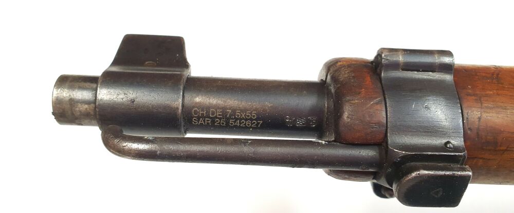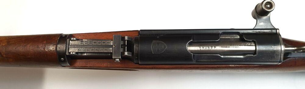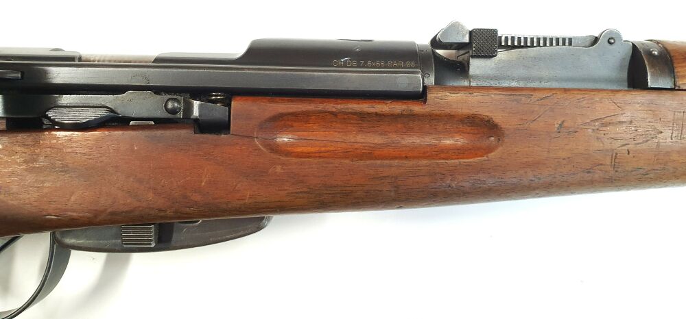 Repetierbüchse, Waffenfabrik Bern, Schweizer K31, Kaliber 7,5x55swiss, ausgesucht hat einen Hämmerli Matchlauf und komplett nummerngleich. Der Karabiner 31 wurde 1931 bei der Schweizer Armee als Standardbewaffnung eingeführt. Die schweizer Armee war die erste Armee, die standardmäßig Geradezug-Repetierer eingeführt hat. Obwohl die Karabiner 31 nie in einem militärischen Konflikt eingetzt wurden, sind die Schweizer Gewehre und Karabiner bekannt für ihre sehr gute Präzision und Schussleistung.