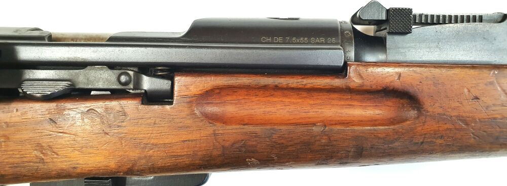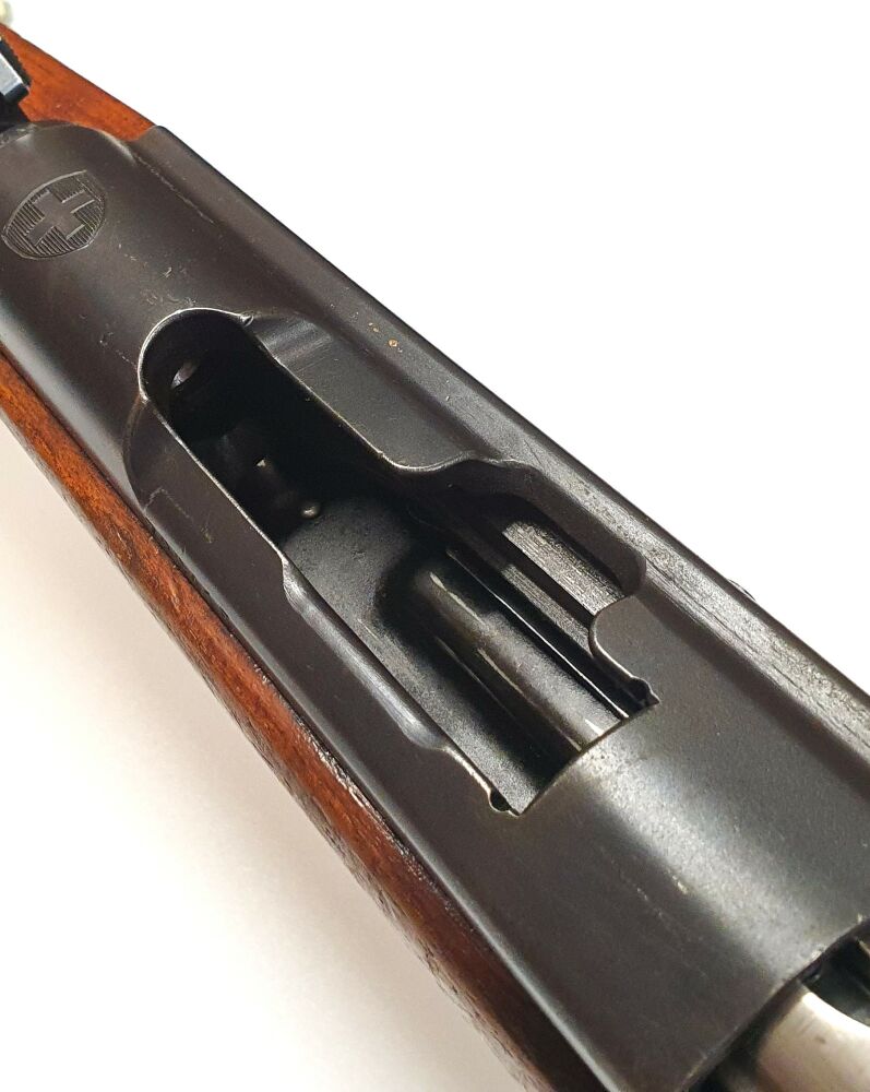 Das vorliegende Gewehr stammt aus Depobeständen der schweizer Armee und wurde vor Ort ausgesucht. Das Gewehr verfügt über einen gültigen Beschuss und ist komplett nummerngleich mit Hämmerli Matchlauf und W&F Linksdiopter mit Korntunnel, Die Waffe ist nicht überarbeitet und dem entsprechend ist der Zustand der Waffe sehr gut. Beiliegend erhalten Sie einen Laderahmen, einen Mündungsschoner, eine Anleitung und einen Riemen.