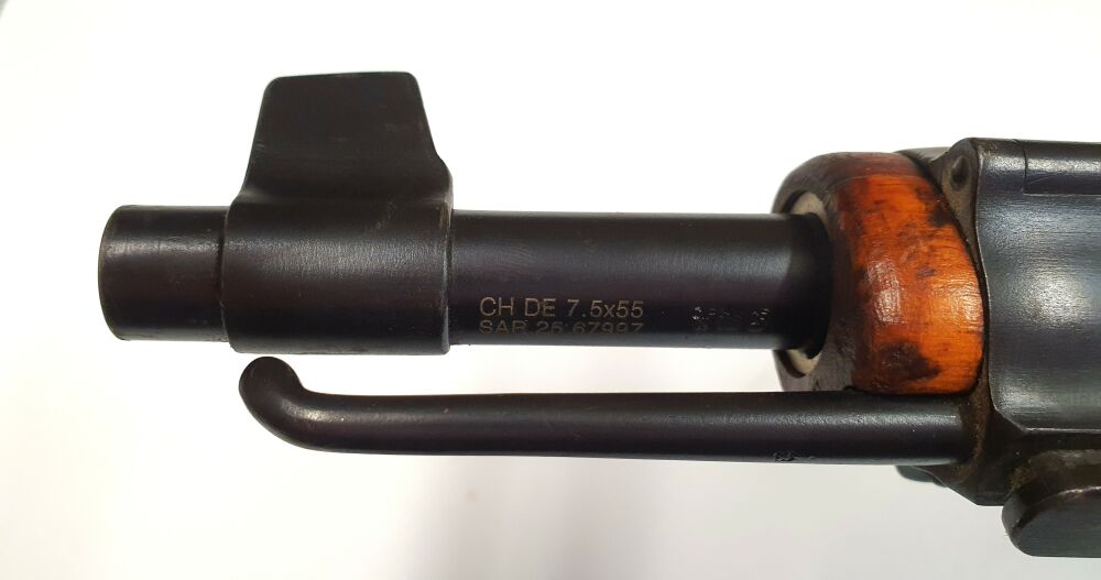 Das vorliegende Gewehr stammt aus Depobeständen der schweizer Armee und wurde vor Ort ausgesucht. Das Gewehr verfügt über einen gültigen Beschuss und ist komplett nummerngleich, auch Bajonett.
