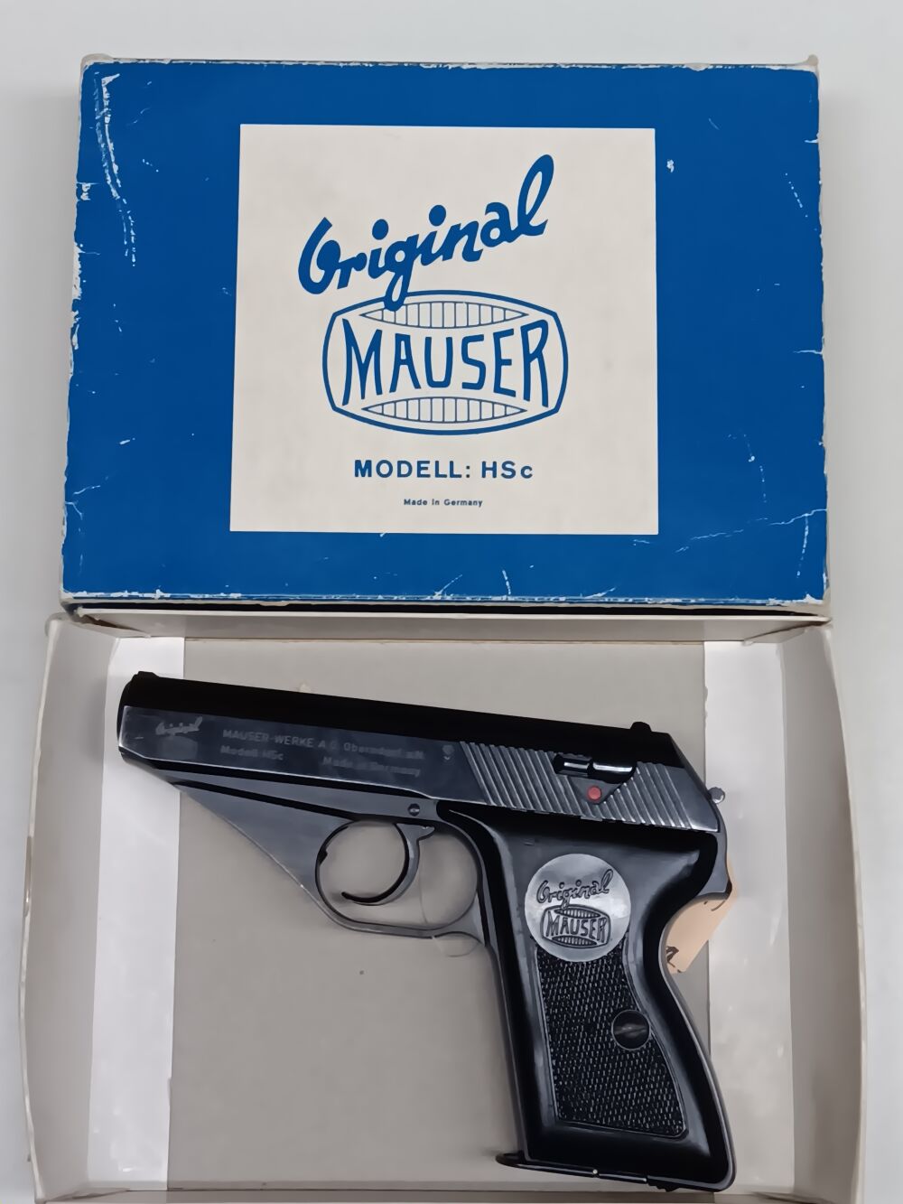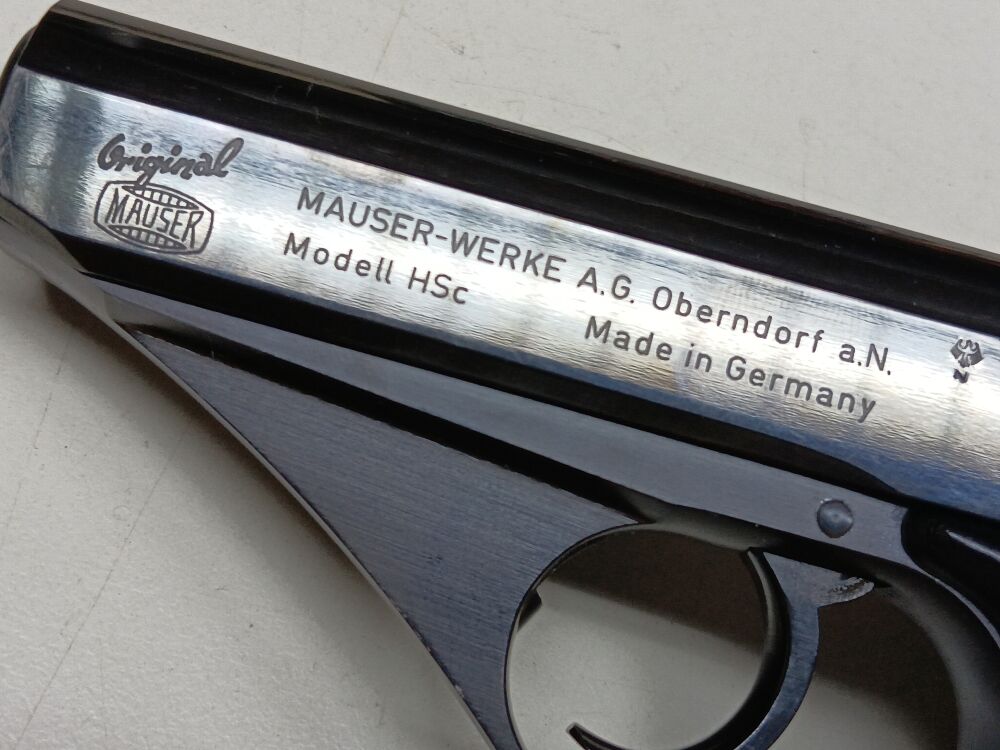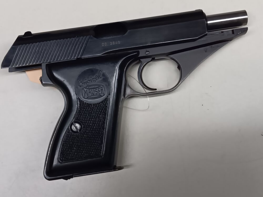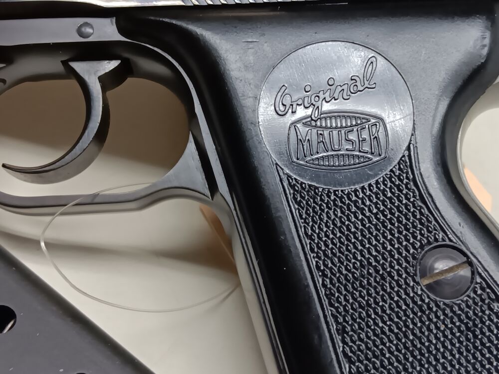 Ganzstahlpistole mit einem 8,5 cm langen spiegelblanken Lauf , Gesamtlänge 16,5 cm , Visierlänge 12,5 cm , seitenverschiebbare Kimme , festes Dachkorn , Double-Action Abzug , außenliegender Hahn , originales Stahlblechmagazin mit Mauser-Bodenstempel für 8 Patronen , originale Kunststoffgriffschalen mit Mauser-Beschriftung , vollständige und fast makellose Originalbrünierung , nummerngleich , Deutscher Beschuß von 1968 , Pistole wird in der Originalschachtel geliefert