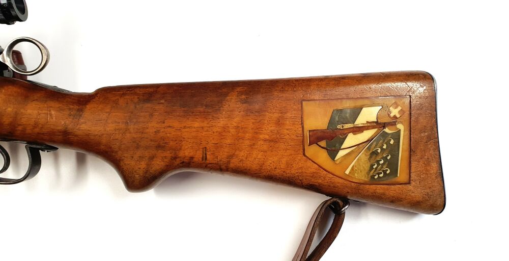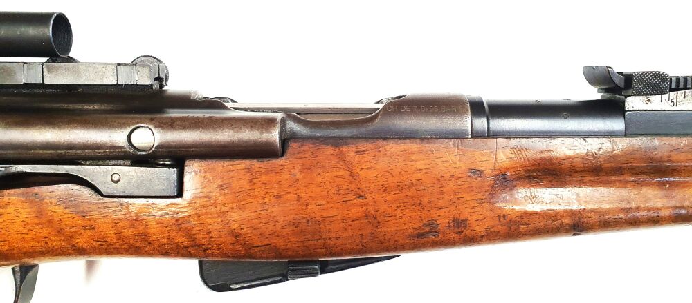 Das vorliegende Gewehr stammt aus Depobeständen der schweizer Armee und wurde vor Ort ausgesucht. Das Gewehr verfügt über einen gültigen Beschuss und ist komplett nummerngleich,außer Magazin und mit W&F Diopter. Die Waffe ist nicht überarbeitet und dem entsprechend ist der Zustand der Waffe sehr gut.
