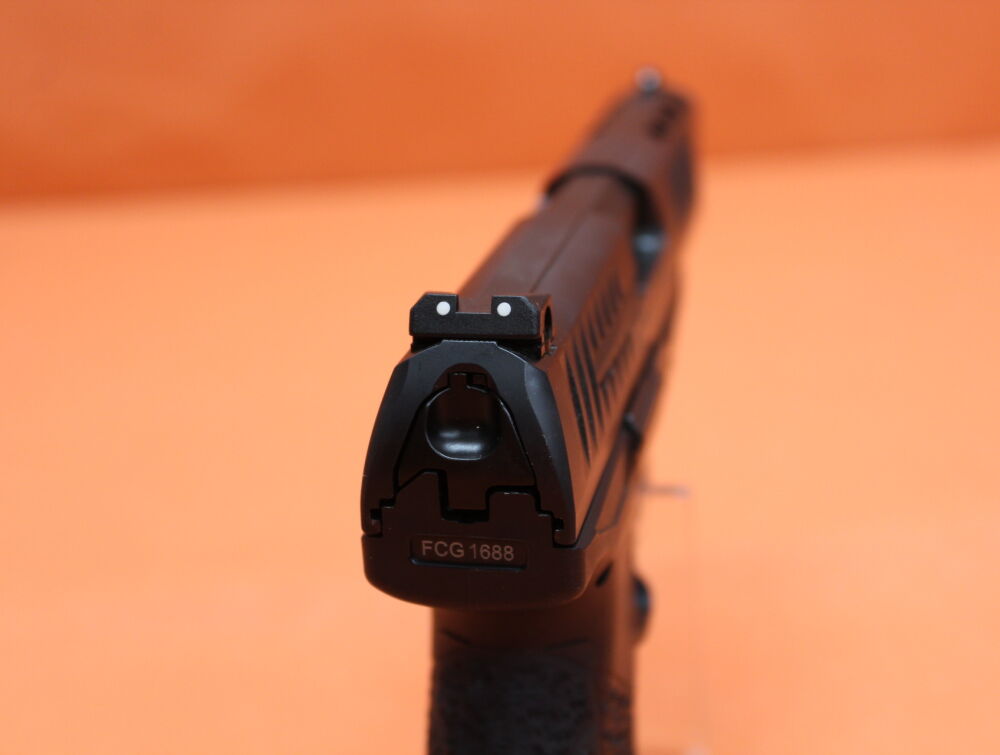 "Sport" 127mm Lauf (5"), KU= verstellbare 3-Dot Polymer-Visierung, Verschluss mit Ladezustandsanzeige, Polymer-Griffstück mit Zubehörschiene (Picatinny), AM = beidseitiger, langer Schlittenfanghebel, M2=Magazinhalter (li/re umbaubar), Quick Defense Abzug ca. 25N (vorgespannt) 15-Schuss Magazin (2813831-LW). Incl. 2 St. auswechselbare Griffrücken/ Reservemagazin/ Ladehilfe. Kunststoffkoffer als Transportverpackung. Gebrauchtwaffe.