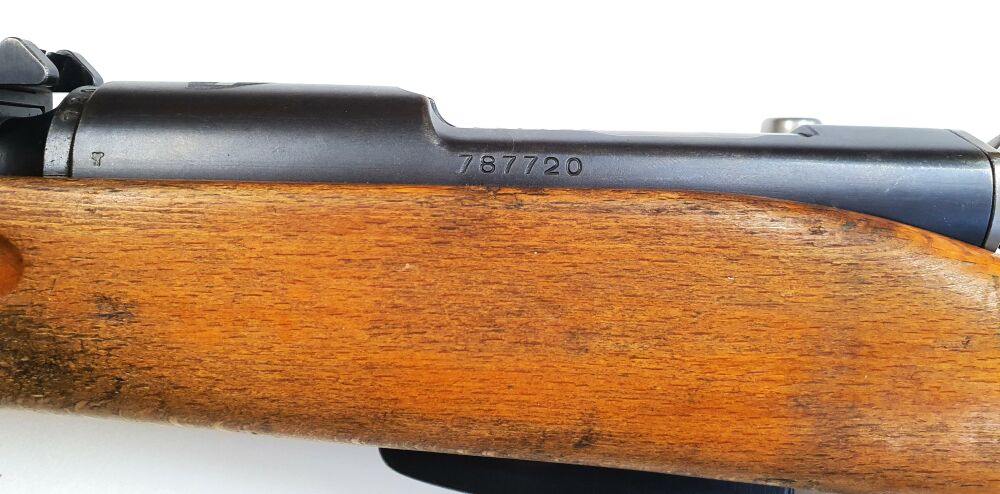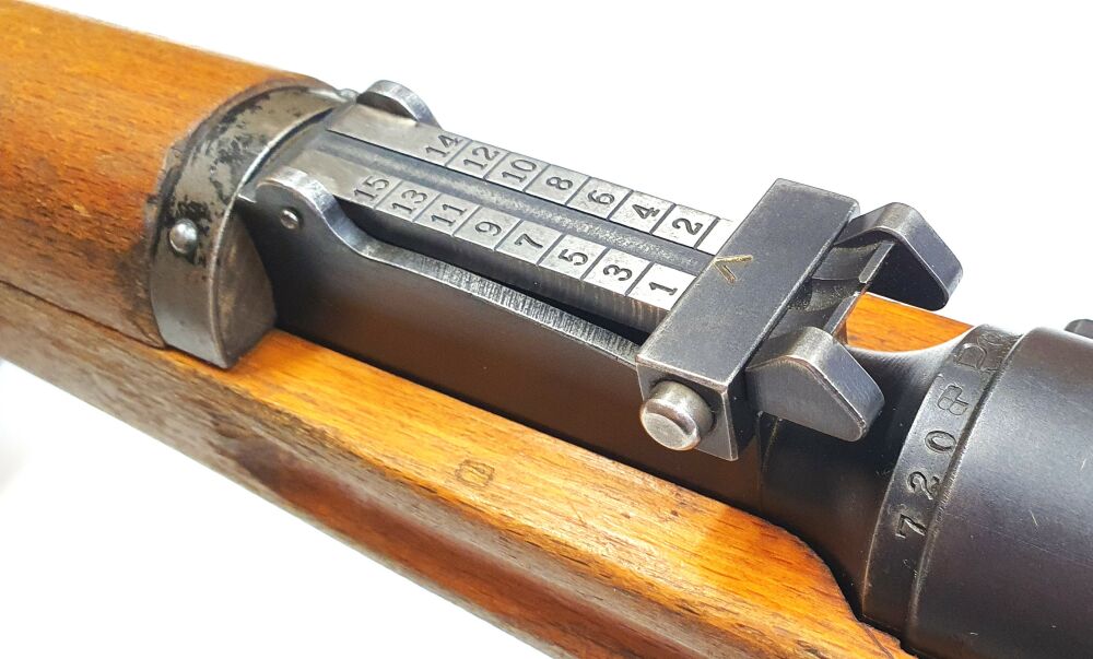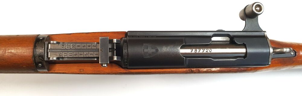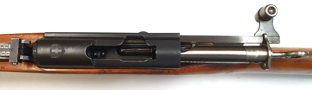 Das vorliegende Gewehr stammt aus Depobeständen der schweizer Armee und wurde vor Ort ausgesucht. Das Gewehr verfügt über einen gültigen Beschuss und ist komplett nummerngleich, auch das Bajonett.