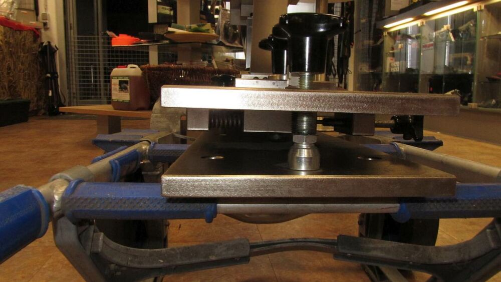 In dem Fall schrauben wir den hinteren Bügel ab, und befestigen das Gerät auf einer halben Einwegpalette (80x60 cm). So ist es Speditionstauglich.