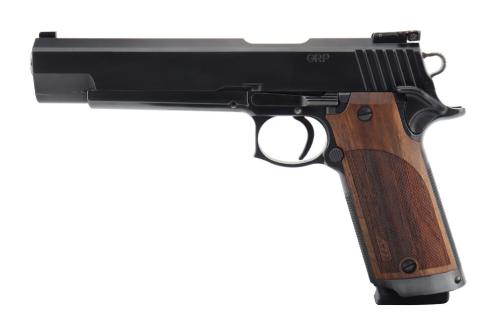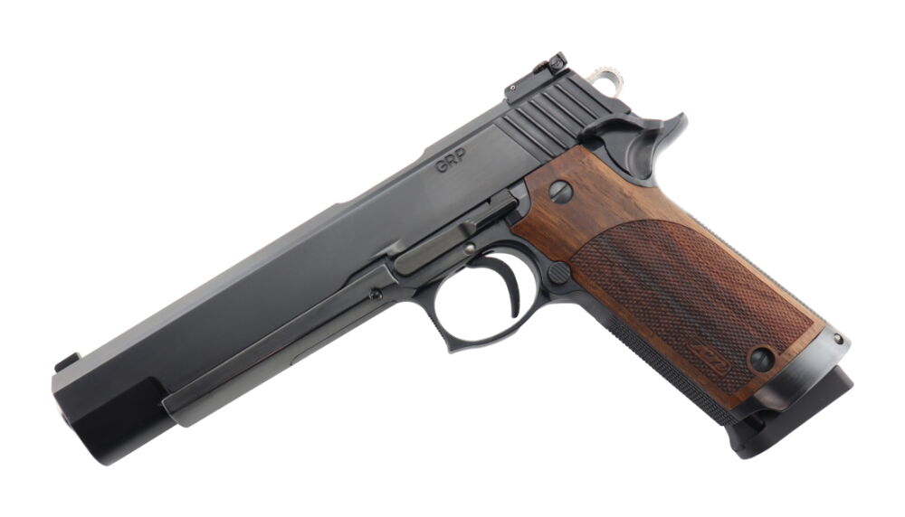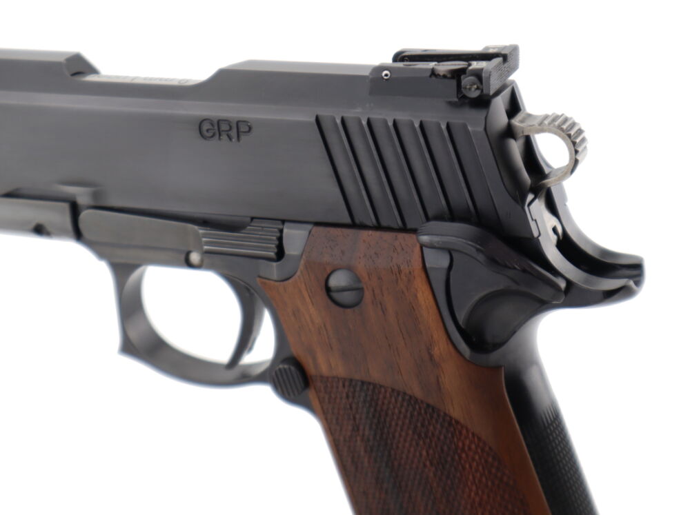 Die speziell für die GRP hergestellten Nussbaum- Griffschalen der Firma Nill liegen perfekt in der Hand und runden das Gesamtbild dieser exzellenten Sportpistole ab.