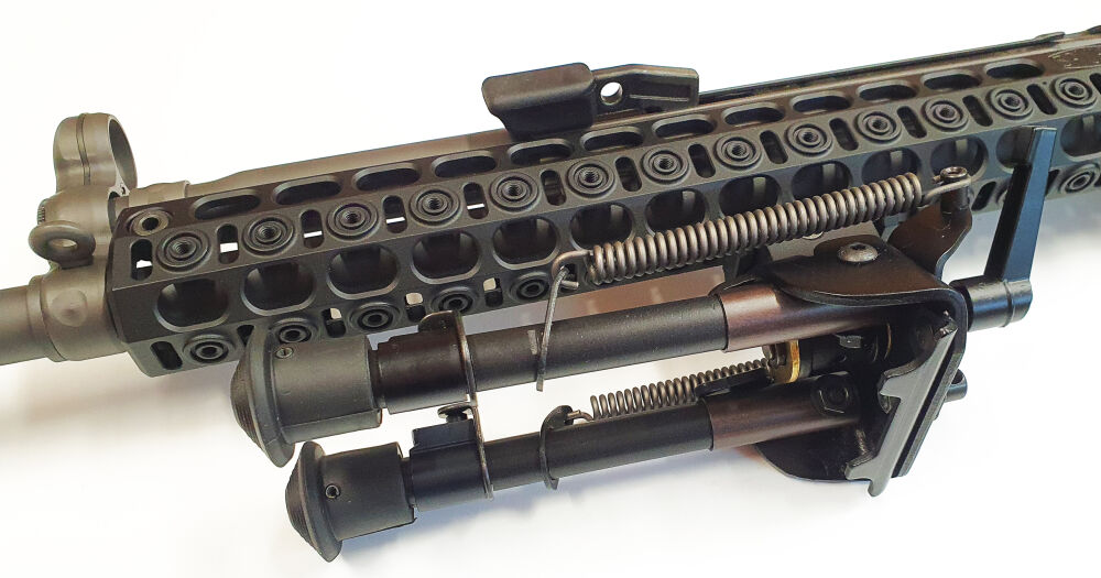 SPUHR Handschutz inkl.55mm Picatinnyschiene mit HARRIS Zweibein. Per Knopfdruck löst man das Ausfahren des Zweibeins aus, das Zweibein ist in der Höhe einstellbar.