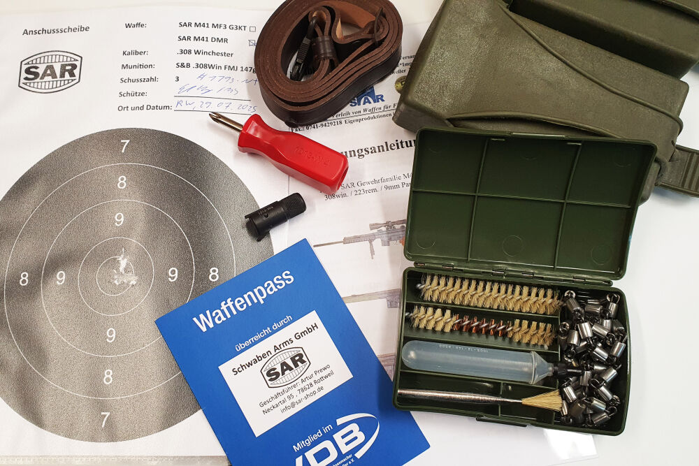 Anschussscheibe, Bedienungsanleitung, Standard Griff schwarz, Standard Mündungsfeuerdämpfer, Putzzeug, Visierverstellschlüssel, Gewehrriemen Leder, Kunststoff Magazintasche.