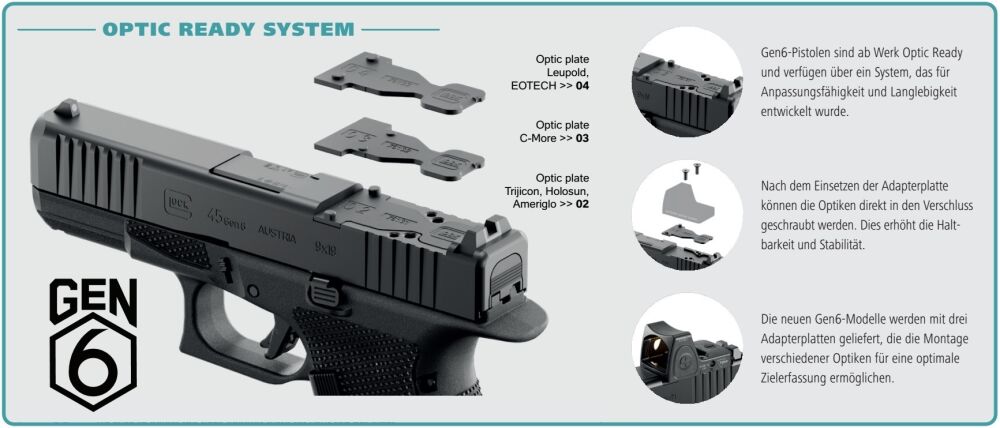 Die GLOCK Gen6 Pistolen mit Standardrahmen sind mit drei Montageplatten für Optiken ausgestattet, die die direkte Verschraubung verschiedener Optiken auf dem Schlitten ermöglichen. Das neue System zeichnet sich durch Anpassungsfähigkeit und Langlebigkeit aus.