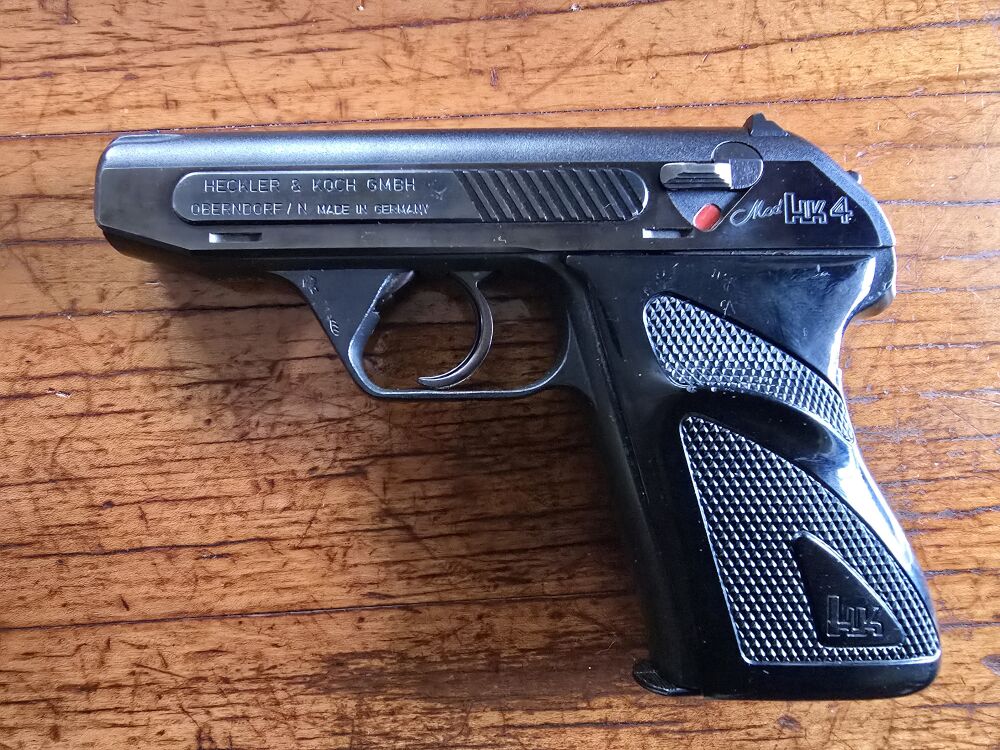Die technisch sehr Interessante HK4 Pistole ,mit Wechsellauf 7,65 Br. 6,35 Br. 22 Lr. Der verschlußkopf der Pistole Lässt sich um 180 grad drehen damit kann mann von Zentralfeuer auf Randfeuer umstel... ...weiterlesen