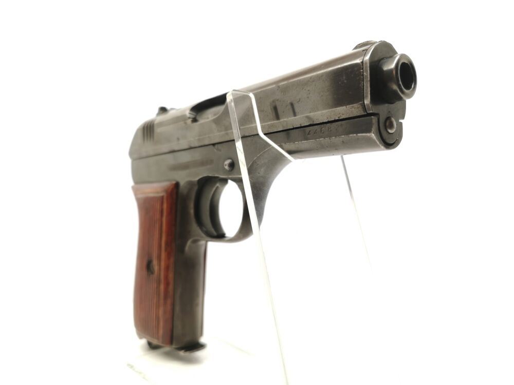 N4027 CZ Uhersky Brod - fnh 27 - Note 2 - tschechische Pistole der Wehrmacht mit Abnahmestempel, Modell CZ 27 (auch vz27) in der fnh-Variante, nachgefertigte Bakeltgriffschale (verm. Nicht original) in braun, kein gültiger BESCHUSS, Wehrmachsabnahme auf Lauf, Nummer 446825 auf Griffstück und Verschlussoberseite, Wehrmachtsabnahme auf Verschlussoberseite (nicht mehr gut erkennbar), Kal. 7,65mm Browning, vom Sammler idealerweise für Sammler oder Export da kein gültiger Beschuss vorhanden, Steckmagazin, technisch in Ordnung, optisch altersbedingt Note 2 *** nur Sammler, Händler oder Export *** *** EWB-pflichtig ***
