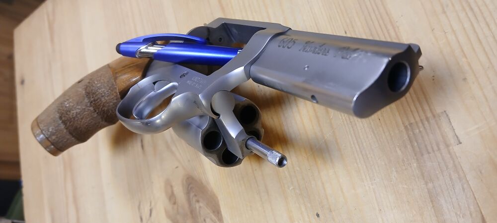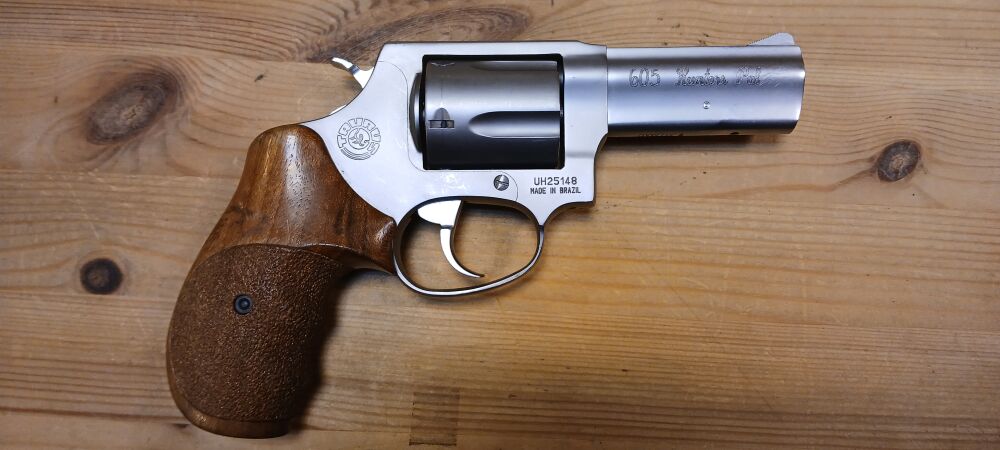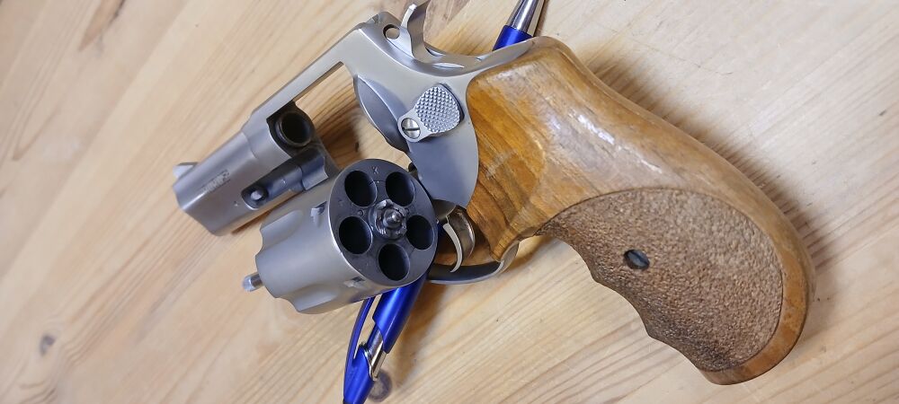 Sehr führiger Revolver mit 5 Schuss-Trommel, Nussbaum-Griffschalen (teilweise punziert) mit Fingerrillen und Daumenauflage für sehr gutes Handling, wenig geschossen, 3 Zoll Lauflänge