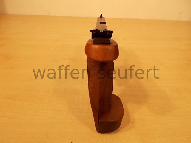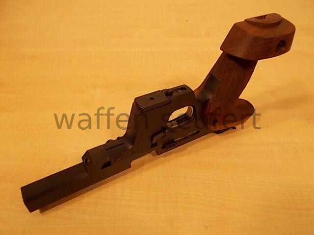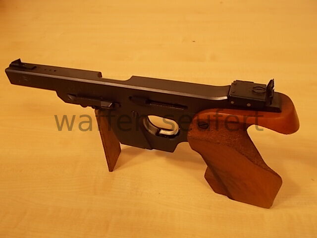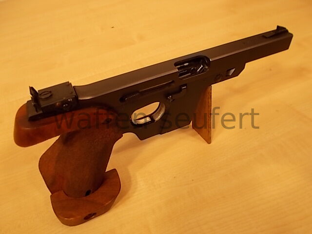 Walther OSP Schnellfeuerpistole in .22Short (22kurz). Sport- und Sammlerpistole gefertigt 1977. Sportpistole für die ehemalige olympische Schnellfeuer-Pistolendisziplin im Kaliber .22short (.22kurz). Um den Rückstoß so gering wie möglich zu halten wurde die Disziplin bis 2004 noch im Kaliber .22 kurz geschossen. Die Walther OSP wurde speziell für dieses Kaliber und die Disziplin konstruiert. Für die Olympische Schnellfeuerpistole ist heute nur noch das stärkere Kaliber .22lr zugelassen. Die .22Short Schnellfeuerpistole wird als rein Deutsche Disziplin noch in einigen Vereinen besonders in Norddeutschland geschossen. Die Walther OSP gehörte zu den erfolgreichsten Sportpistolen in dieser Disziplin. Aufgrund der außergewöhnlichen Konstruktion und der bekannt guten Verarbeitung ein Stück Sportgeschichte und interessantes Sammlerobjekt. Laufprofil spiegelblank, Züge und Felder scharfkantig. Mit höhen- und seitenverstellbare Targetvisierung auswechselbaren Korn und feinem Matchabzug. Anatomische Formgriffschale mit verstellbarer Handkantenauflage und Daumenauflage aus Nussbaum. Grifffläche mit Hammerschlag punziert. Gepflegter sehr guter, fast neuwertiger Erhaltungszustand. Mit Ersatzmagazin und orig. Koffer! Kaliber .22short (.22kurz). Beschuss: Ulm 1977. Lauflänge: Ca.10,5 cm. Visierlänge: Ca. 25 cm. Gesamtlänge: Ca. 29 cm. Gewicht: 1,15 kg. Zum Kauf dieses Produkts ist die Vorlage der Erwerbsberechtigung erforderlich!