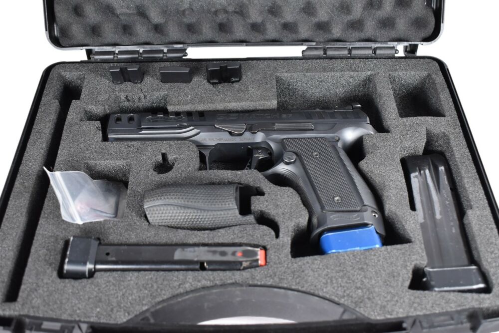 Lieferumfang: Koffer, 6 Magazine (mit beschädigten Magazinböden), Griffschalen, 3 Optikplatten, alter Standardabzug