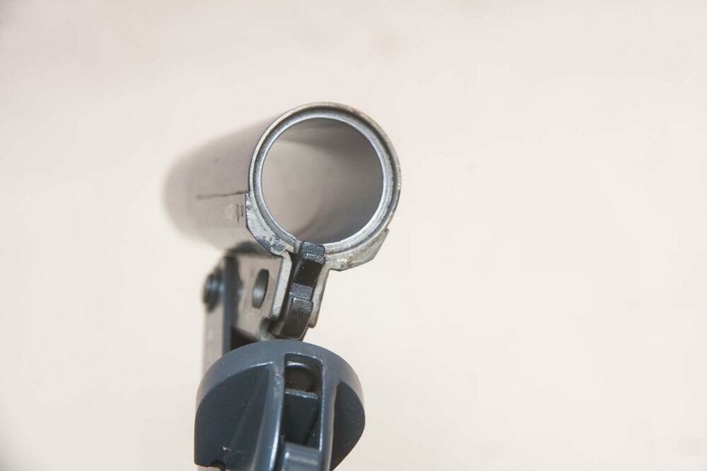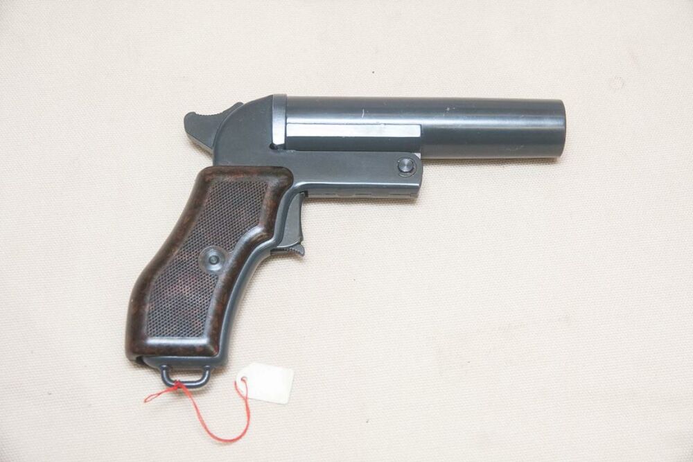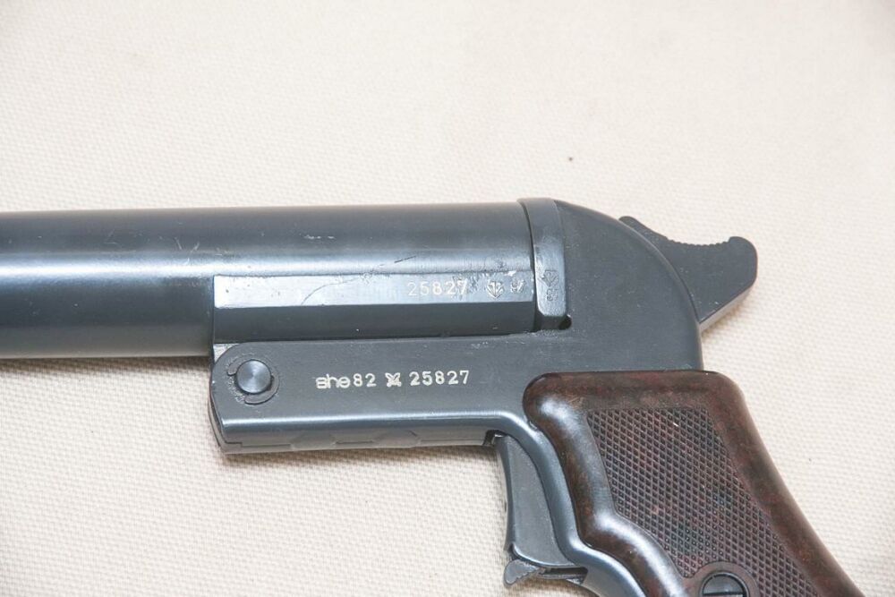Lauflänge: 150 mm, Lauf und Griffstück aus grau lackiertem Stahl, Öffnungsdruckknopf an der Unterseite des Abzugs, auf der linken Seite der Herstellercode: 'she' sowie das Herstellungs... ...weiterlesen