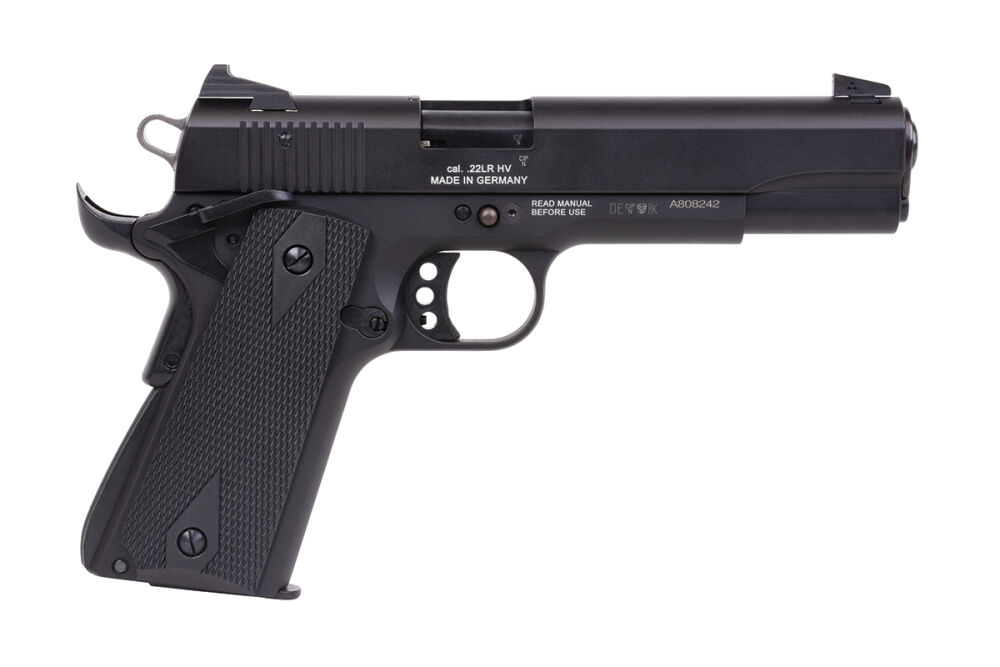 Die GSG-1911 Selbstladepistole im Cal. .22 aus Vollmetall mit schwarzen Kuststoffgriffschalen im klassischem 1911-Full Size-Format verfügt über eine Magazin-, Fall- und Schlagbolzensicherung, eine beidseitige Drehhebelsicherung, eine Handballensicherung, einen einstellbaren Triggerstop und einen gelochten Abzug (Single-Action).