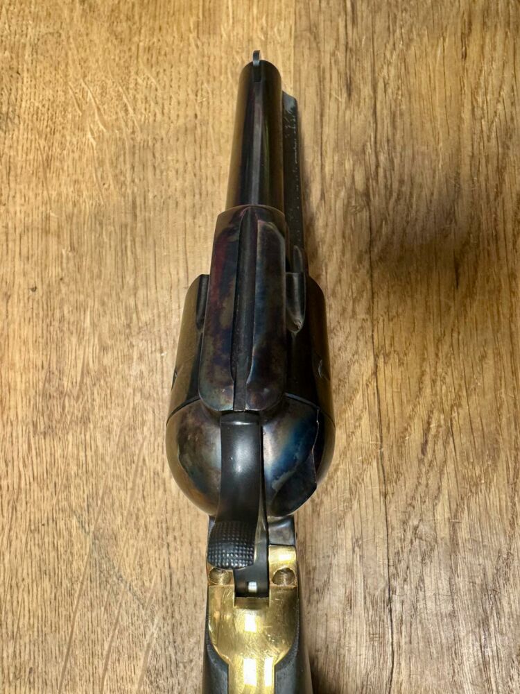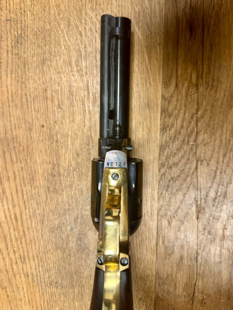Der Revolver hat Holzgriffschalen und einen buntgehärteten Rahmen.