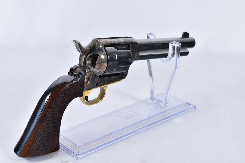 Dieser Pietta 1873 S.A. Tombstone I im Kaliber .44-40 WCF ist ein Revolver mit einer Lauflänge von 13,9 cm und einem Gewicht von 1,090 kg. Die Magazinkapazität beträgt 6 Schuss. Der Zustand wird mit 2 bewertet, was normale Gebrauchsspuren und eine moderate Schussbelastung bedeutet. Die Griffschalen sind aus Holz gefertigt.