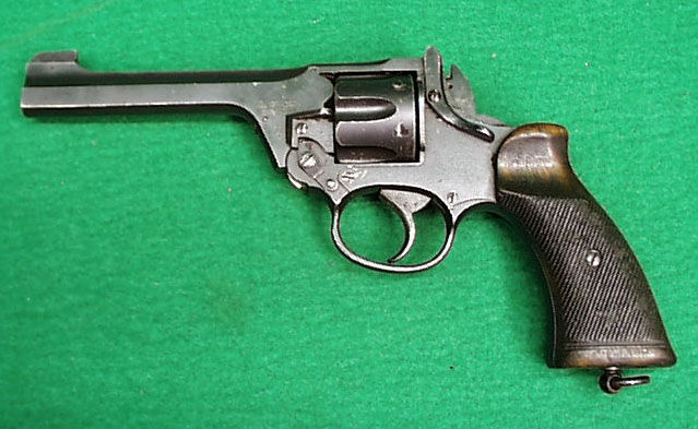 Enfield Revolver No.2 MK 1* Kal.38 S&W, Baujahr 1941, Double Action only, mit Fangschnur, Holzgriffschalen, Gesamtlänge 26cm, Lauflänge 12,5cm, Gewicht 0,78kg, Lauf innen blank, Trommelbohrungen ... ...weiterlesen