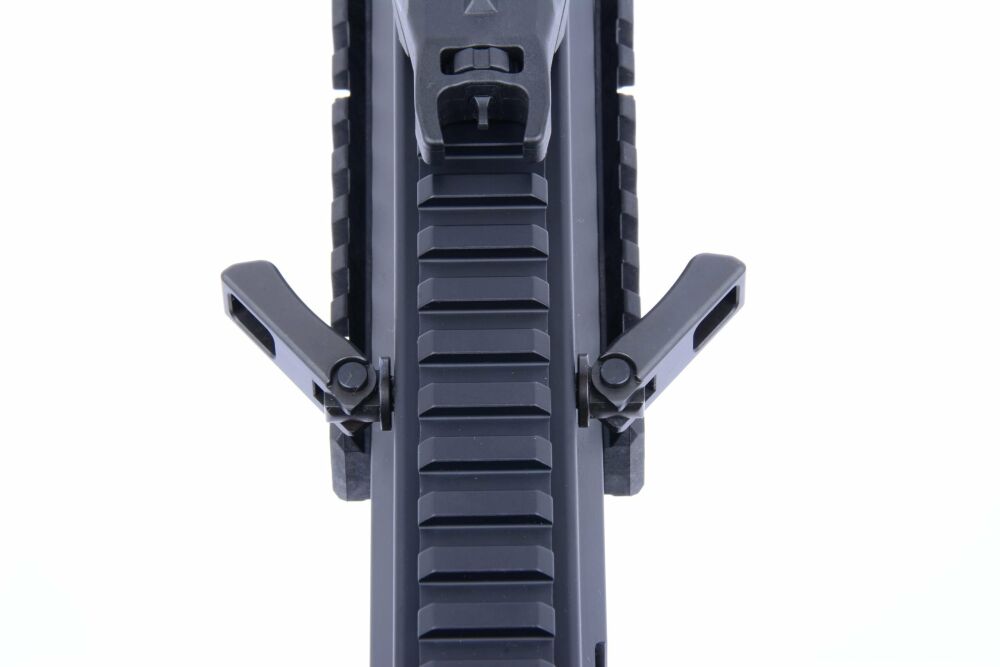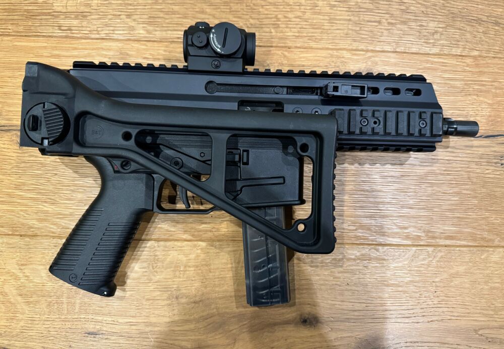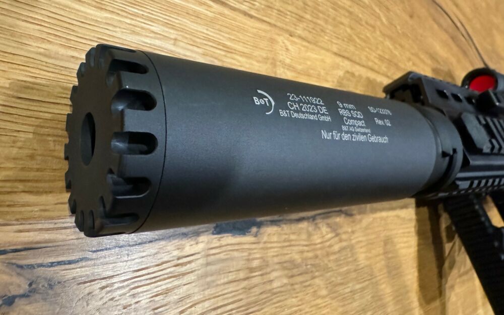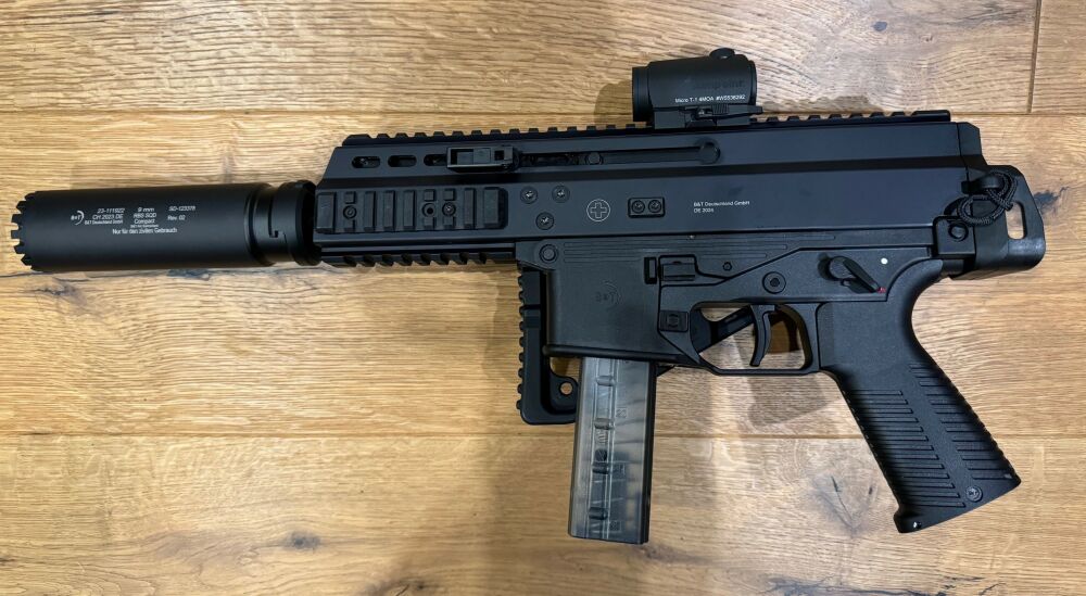 Die Waffe verfügt über den B&T Klappschaft sowie eine Tri-Lug kompatible Mündungskomponente.