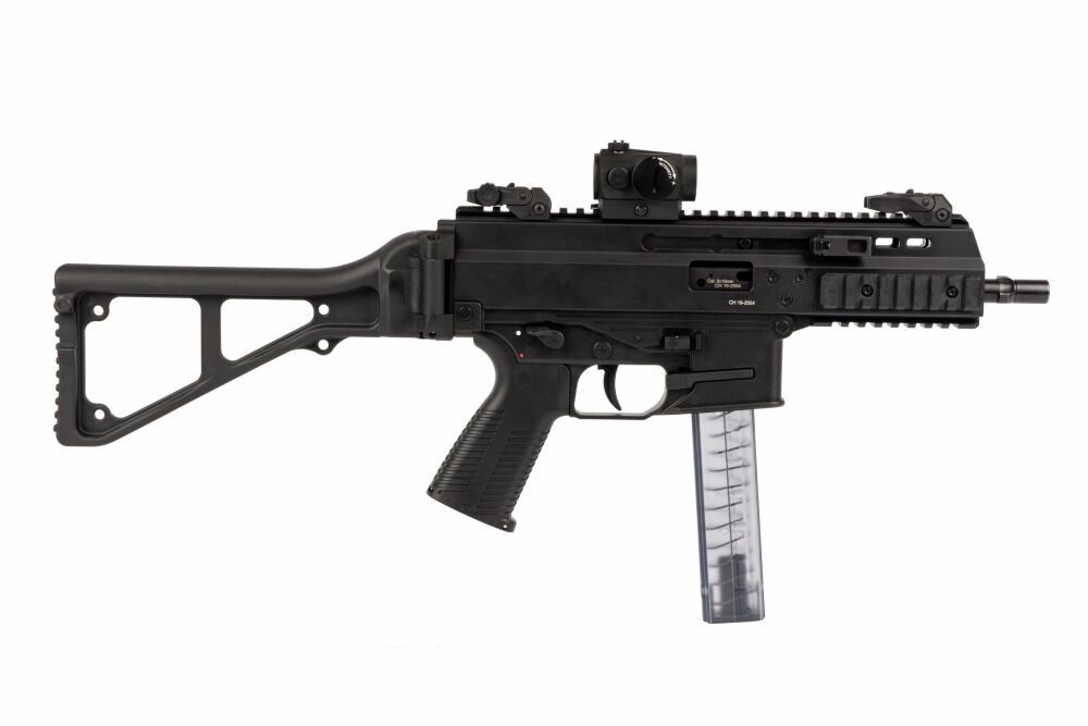 Kal. 9x19mm, Lauflänge 175mm - Aimpoint® Micro T-1, klappbares Notvisier - beidseitiger, klappbarer, nicht mitlaufender Ladehebel - Klappschaft - 3-Lug Schalldämpferanschluss - 3x Magazine 15/30 Schuss - Vordergriff, Putzzeug, Tragriemen, Koffer & Manual Kurzwaffe: 266mm/387mm