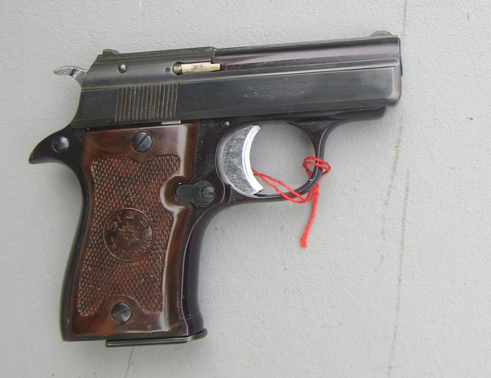 Pistole STAR Spanien Mod. Starlet Kal. 6,35 Brow. Magazin 7 Schuss LA Griffstück mit breitem Beavertail, Sicherung Hammersporn breit kreuzgeriffelt in original Kunststoffbox und passende Ledert... ...weiterlesen