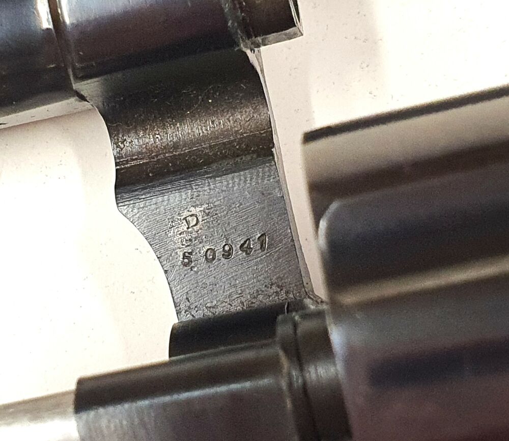 Brünierter Stahlrahmen und Holzgriffschalen.