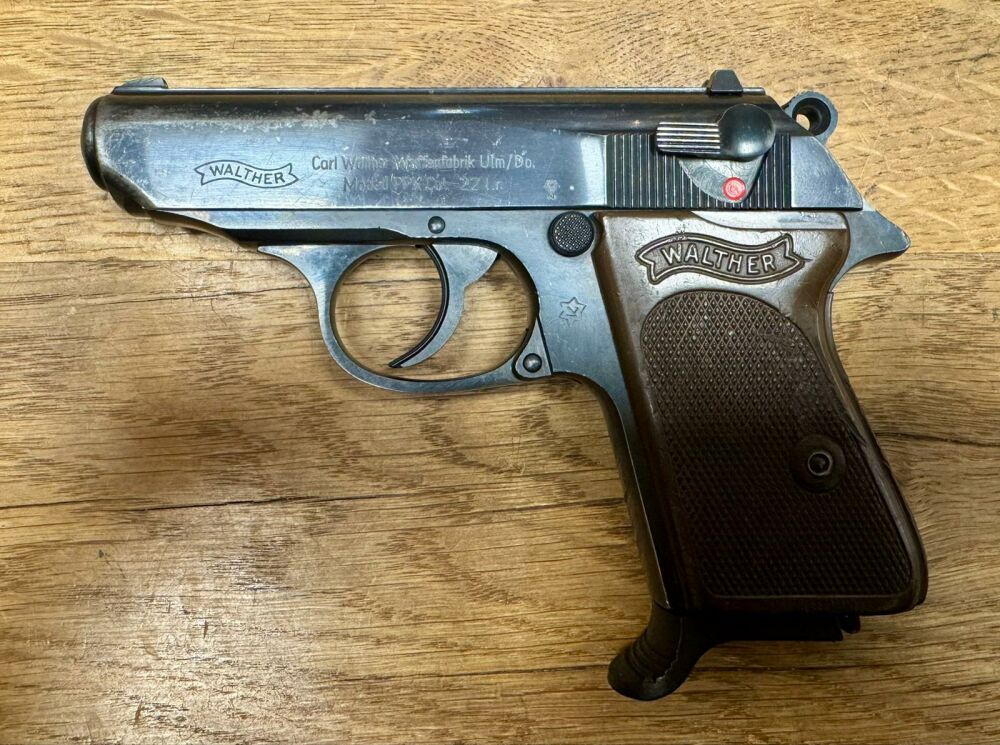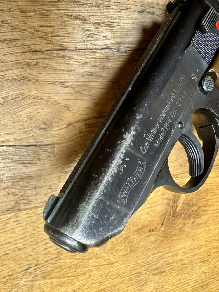 Verkauft wird eine: Pistole, Walther, Mod. PPK, Kal.: .22lr. Die Waffe wird mit einem Einsteckmagazin verkauft. Die Waffe ist in gebauchten Zustand, siehe Fotos. Brünierung an vielen Stellen... ...weiterlesen