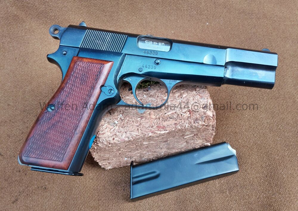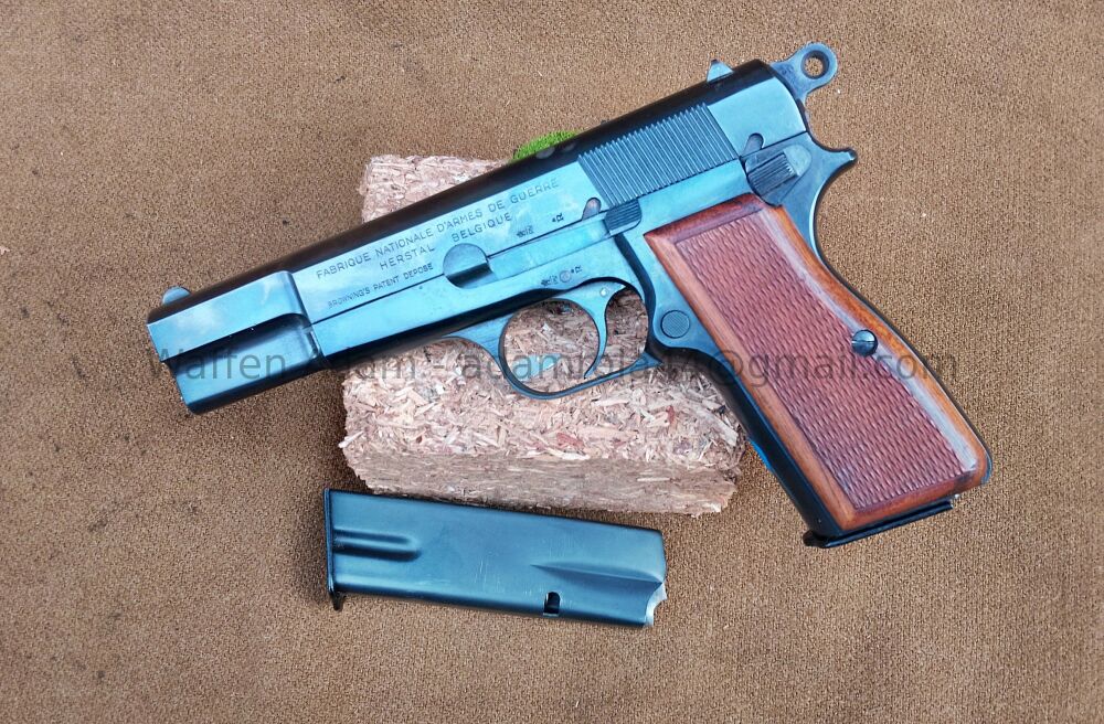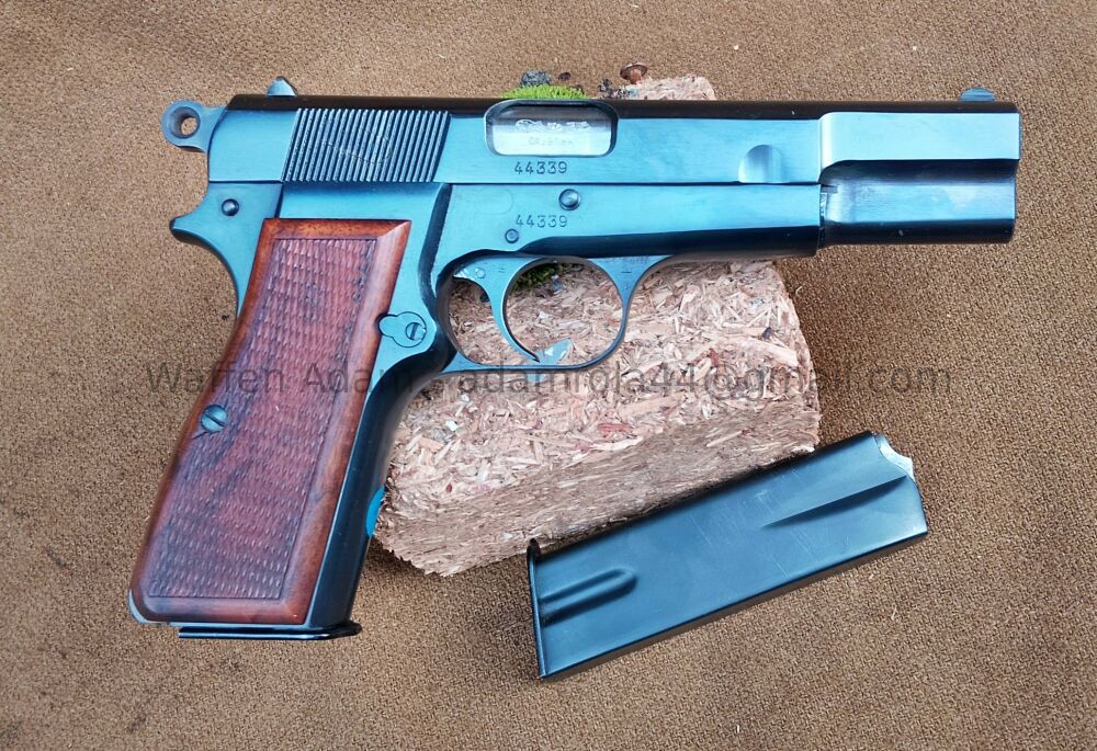 FN High Power, Fertigung ca. 1960 (?) Hochwertige Ganzstahlwaffe. 13 Schuss doppelreihiges Stangenmagazin. Nr.44999, nummerngleich. Blanker Lauf. Mech Visierung mit U Kimme und Balkenkorn. Kam gesch... ...weiterlesen