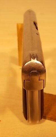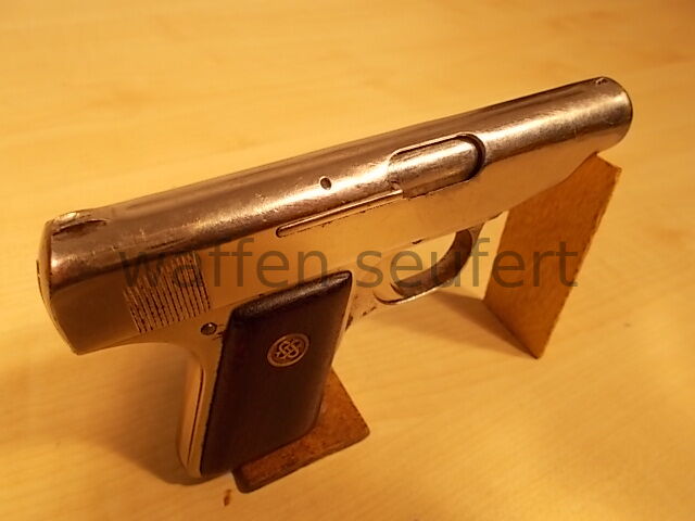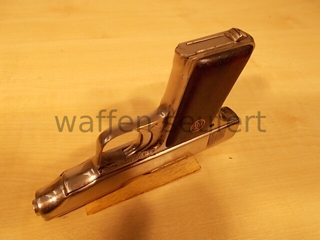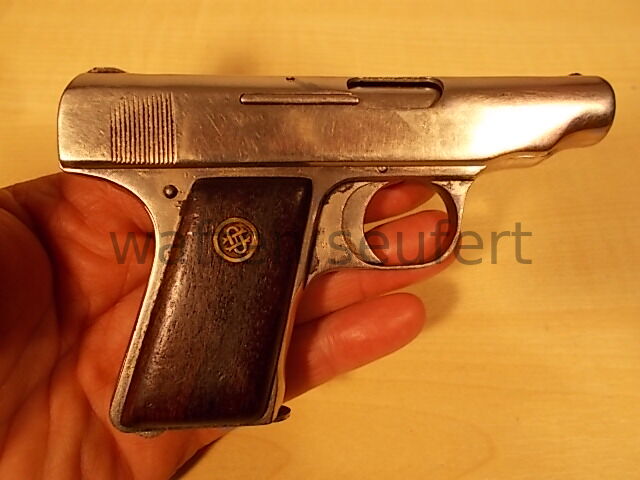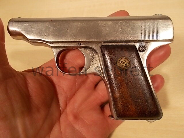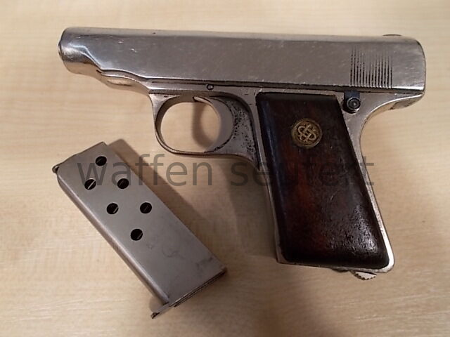 Ortgies 6,35 Pistole vernickelt nach der S/N und den HO Griffschalen noch aus der frühen Originalfertigung von Firma H. Orgies & Co. 1919 bis 1921. Kaliber .6,35mmBrowning. Die Pistole wurde vermutlich nachträglich neu vernickelt und dafür komplett abgeschliffen und die äußerliche Originalbeschriftung entfernt. Originalstempel des Werks sind nur auf der Innenseite zu sehen. Aufgrund der großen Nachfrage wurden ab 1921 die Ortgies Pistolen bei Deutsche Werke Werk Erfurt gefertigt. Laufprofil spiegelblank, Züge und Felder scharfkantig. Die berühmte Taschenpistole von Heinrich Ortgies mit den genialen Konstruktionsmerkmalen schlanke, handliche Form, engste Passungen, schraubenlose Konstruktion, Griffstücksicherung mit permanenter Entsicherung und zusätzlichen Sicherungsknopf. Voraussetzung für die Konstruktion war die außergewöhnlich gute Verarbeitung mit den engen Passungen. Die Ortgies Pistole wurde 1916 patentiert und bis 1921 gefertigt. Danach übernahmen die Deutschen Werke das Patent bis zur Einstellung der Produktion ca. 1924. Griffstücksicherung für permantente Entsicherung und zusätzlichen Sicherungsknopf mit dem die Pistole wieder gesichert und entspannt werden kann. Mit herausnehmbaren Magazin. Originalbeschriftung/Stempel. Schlitten : 8900. Lauf: 8900. Griffstück: Linksaußen S/N 1214, Griffstück innen 11 Y, auf der Griffstückverlängerung unter dem Lauf 9 und Fragmente einer Beschriftung die aber nicht mehr zu entziffern sind, auf dem Halteblock für den Lauf 2. Griffstück am Verschluss unten: 50 R 11. Holzgriffschalen mit Emblem HO vergoldet. Herausnehmbares Magazin vernickelt gestempelt mit 6,35 m/m und dem Emblem der Deutsche Werke Erfurt als Fragment. Gepflegter guter Zustand. Kaliber: .6,35mmBrowning (.25ACP). Lauflänge: ca. 7 cm. Maße: 14 x 8,5 cm. Gewicht: 390 g. Keine Originalbeschusszeichen der Weimarer Republik. Neubeschuss: CIP Mellrichstadt 2022. Der Neubeschuss wurde aus sammlerischen Gründen dezent verdeckt angebracht. Zum Kauf dieses Produkts ist die Vorlage der Erwerbsberechtigung erforderlich!