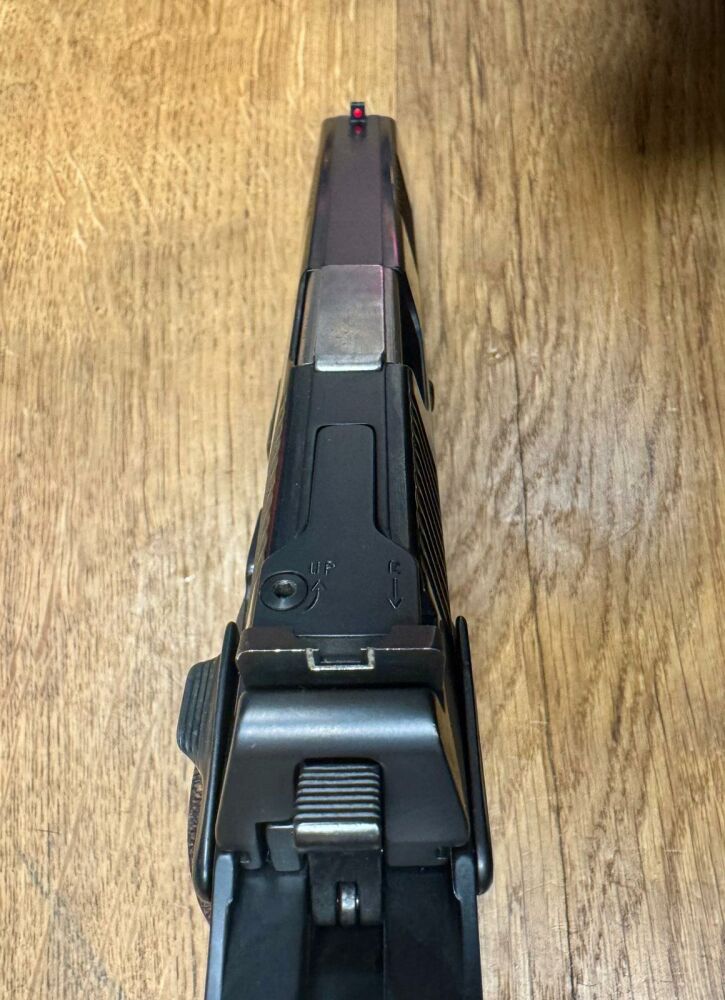 Die Waffe ist in gutem gebauchten Zustand, siehe Fotos. Brünierung gut erhalten, kein Rost. Im Griffstück sind Gewindebohrungen angebracht.