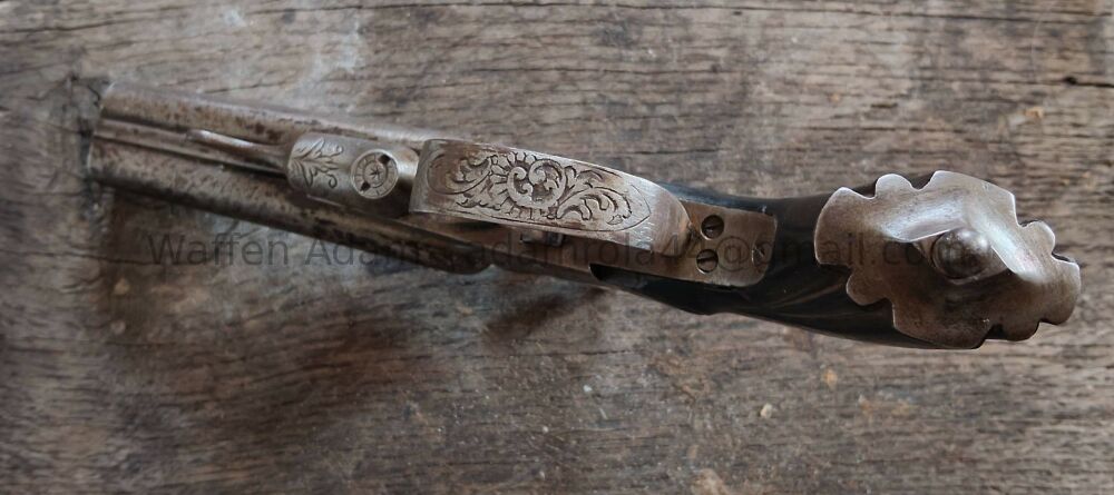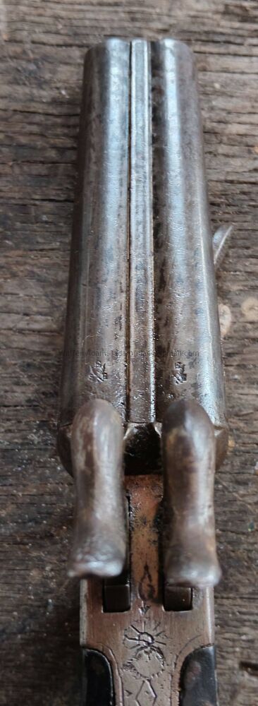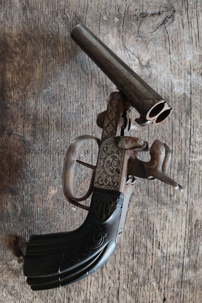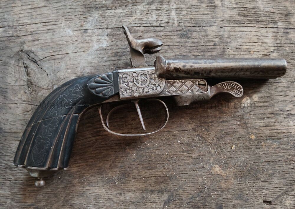 Sammler Waffe , - Pistolet de Vienerie - Doppelläufiges, graviertes Stiftfeuer Terzerol, Beschuss St. Etienne / Frankreich Gezogener Lauf .Reparierter Ebenholz Griff mit geschwungenem schönen Stahla... ...weiterlesen