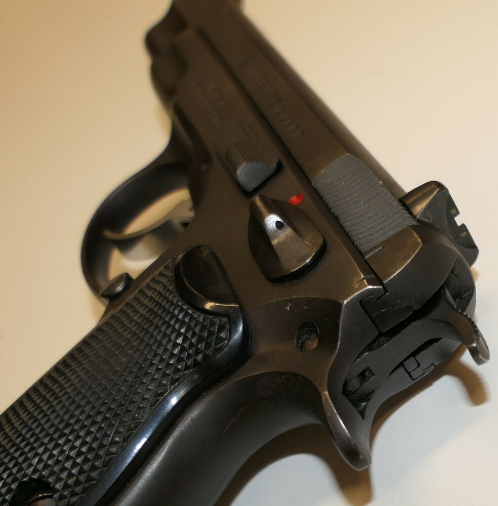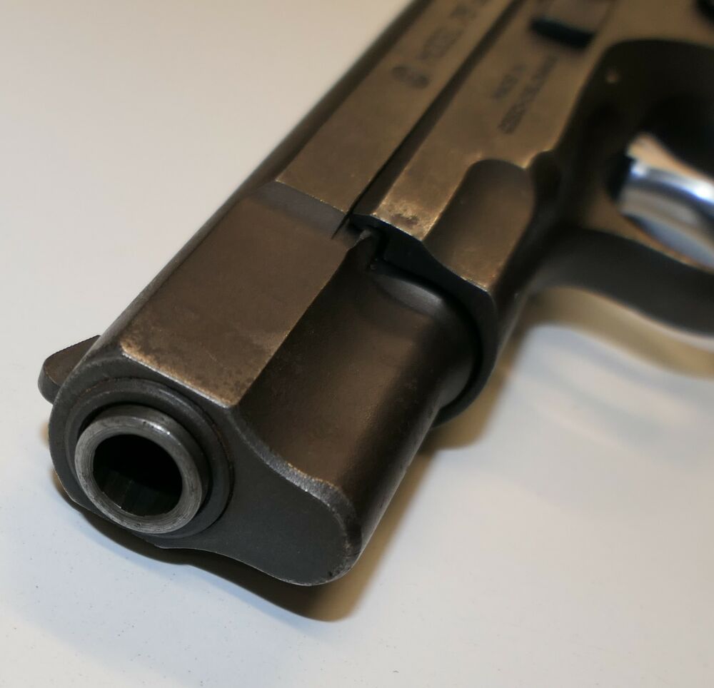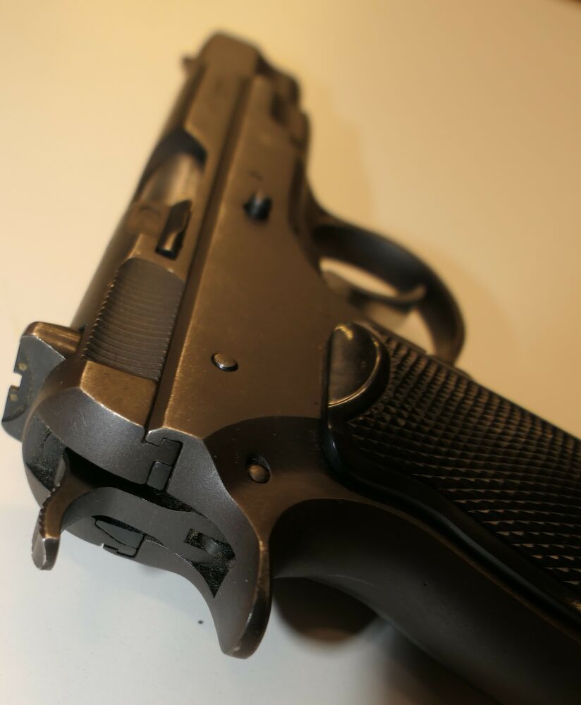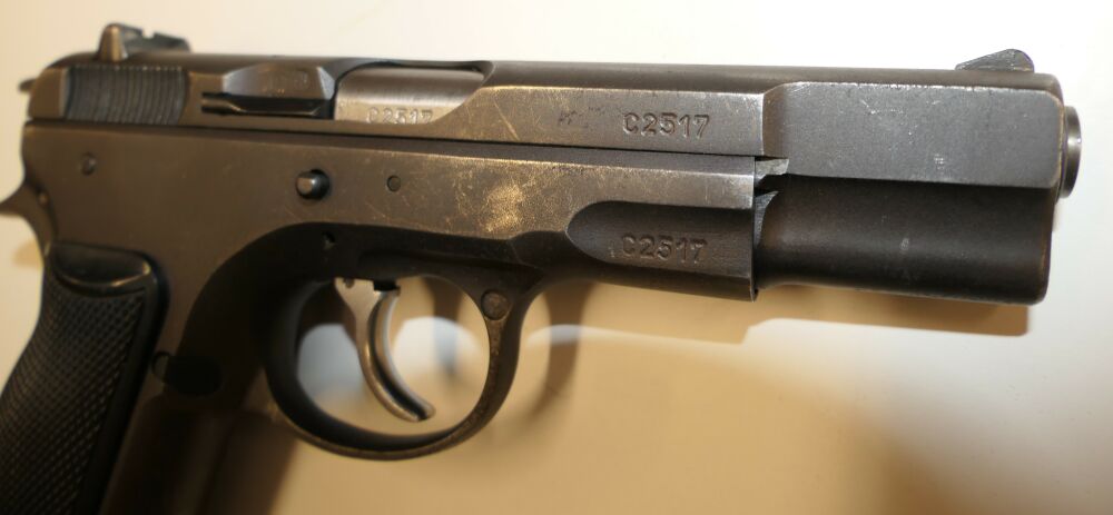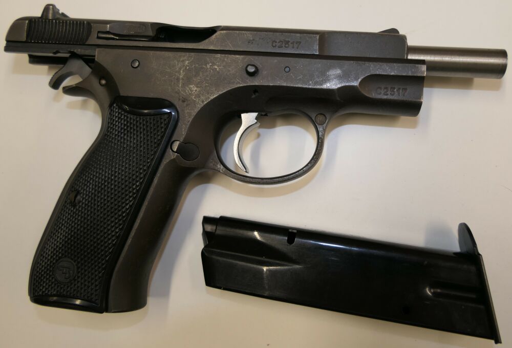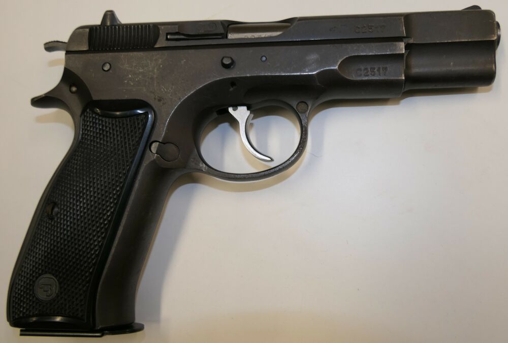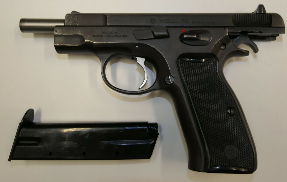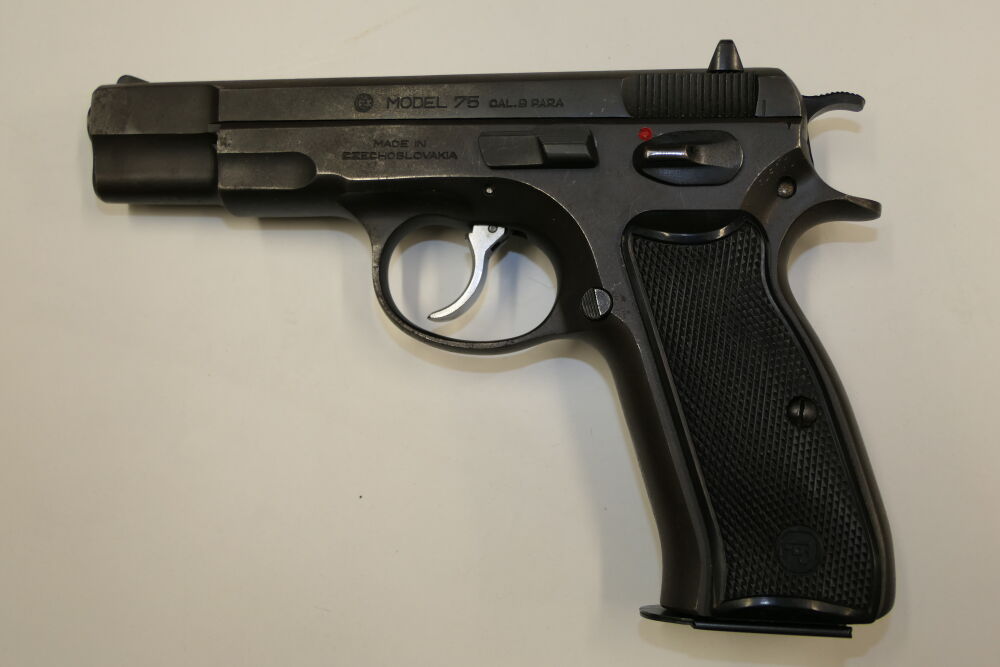 Halbautomatische Pistole, CZ75 B, 9x19mm; 9mm Para; 9mm Luger. Die ČZ 75 wurde 1975 von der Česká zbrojovka in Uherský Brod als Behördenwaffe herausgebracht. Es handelt es sich um eine Ganzstahlwaffe mit Double-Action-Spannabzug und Browning-FN-Verschlusssystem. Das revolutionäre Element der Waffe ist ihr DA/SA-Abzugssystem, welches in beiden Modi mit gleicher Kraft auf den Schlagstift einwirkt und aufgrund seiner Geometrie im SA-Modus einen praktisch linear ansteigenden Kraftaufwand sicherstellt. Entwickelt wurde die Pistole während des Kalten Krieges hauptsächlich für den Export, eine wichtige Devisenquelle für die damalige Tschechoslowakei.