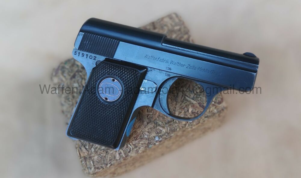 Walther Modell 9, die "kleinste Walther" formschöne Taschenpistole. Ganzstahlwaffe mit hoher Verarbeitungsqualität. Griffschalen mit Emmaile Medallions CW, Carl Walther. Nummerngl. Lauf b... ...weiterlesen