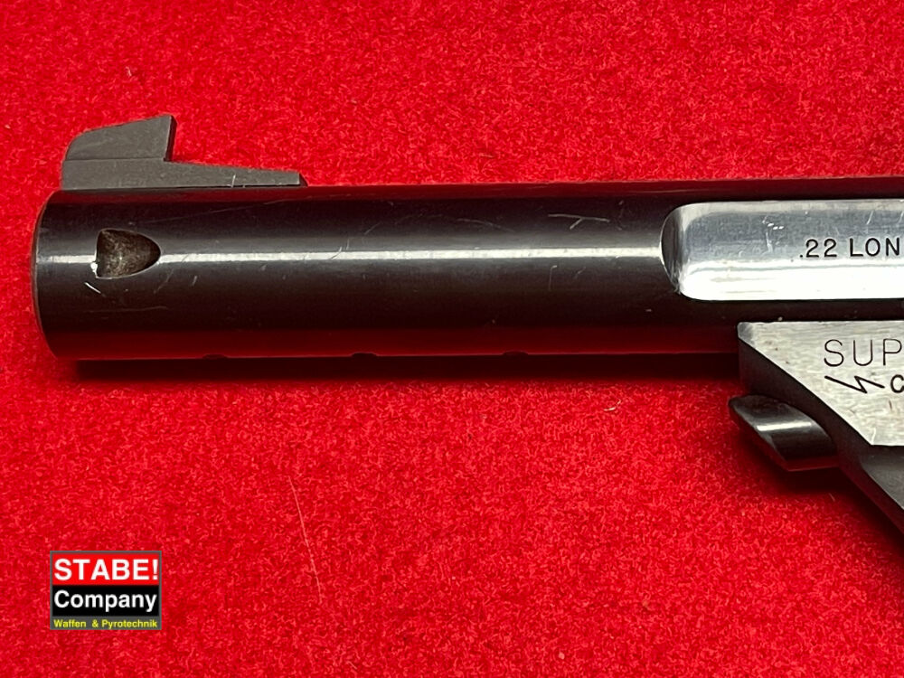 Ganzstahl brüniert feine Mikrometervisierung 5,5 Zoll Lauflänge Triggerstop Sportkorn Nussbaum Holzgriffschalen, punziert mit Daumenauflage für rechts gute Schusspräzision 10 Schuss M... ...weiterlesen