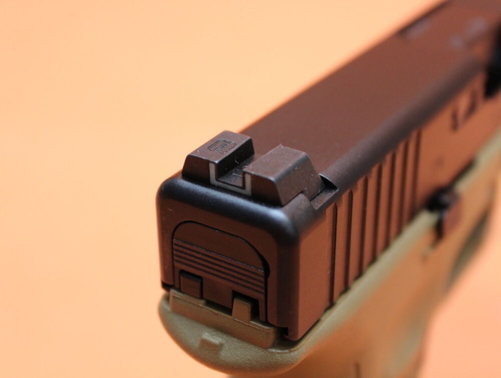 114mm GMB (Glock Marksman Barrel) Lauf, Verschluß mit Front Serrations, starre Stahl-Kontrastvisierung (nachleuchtend), Gen5 RTF Polymer-Griffstück (Coyote) mit Zubehörschiene (Weaver)/ angetrichterter Magazinschacht/ Fangriemenöse, Gen4 Magazinhalter (li/re umbaubar), beidseitiger Verschlussfanghebel, Safe Action Abzug ca. 25N (teilvorgespannt, 2,5kg Steuerfeder), 17-Schuss Magazin (65363). Incl. 2 St. auswechselbare Griffrücken/ Reservemagazin/ Ladehilfe/ Putzstock/ Putzbürste. Kunststoffkoffer als Transportverpackung.