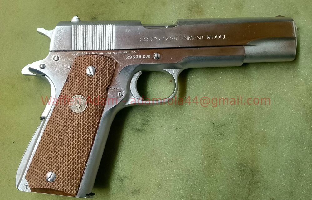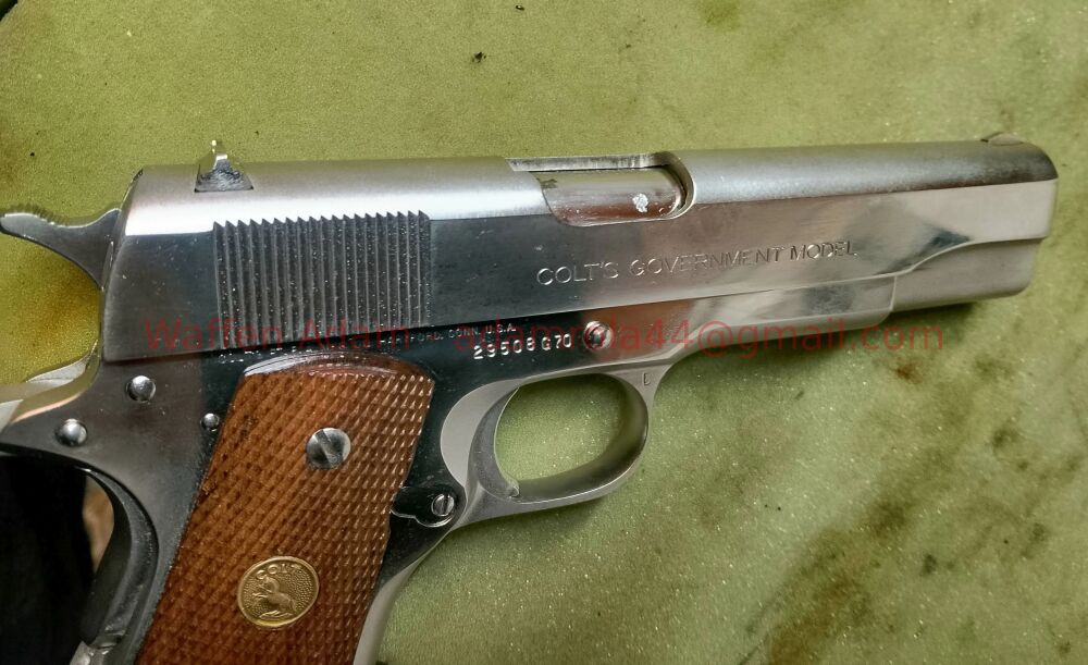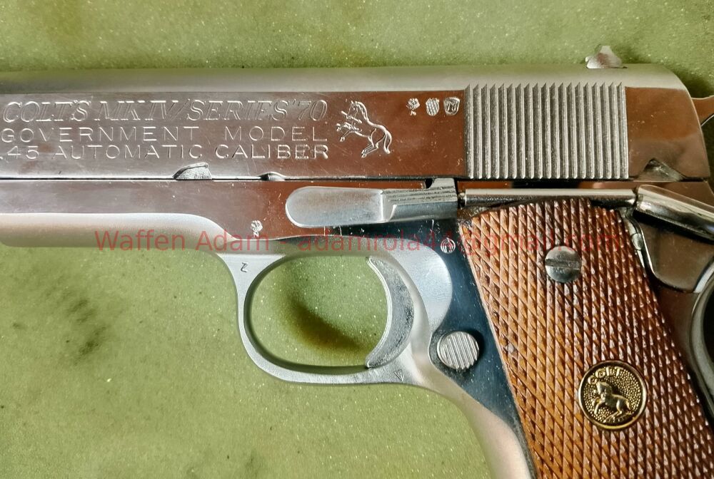 Seltene Colt MK IV, Series 70, Nickel Government Kaliber .45, aus Sammlung, nahezu ungeschossener Zustand, Beschuss von 1977. Mittelbraune Nussholz Griffschalen mit vergoldetem Emblem. Gebrauchtwaff... ...weiterlesen