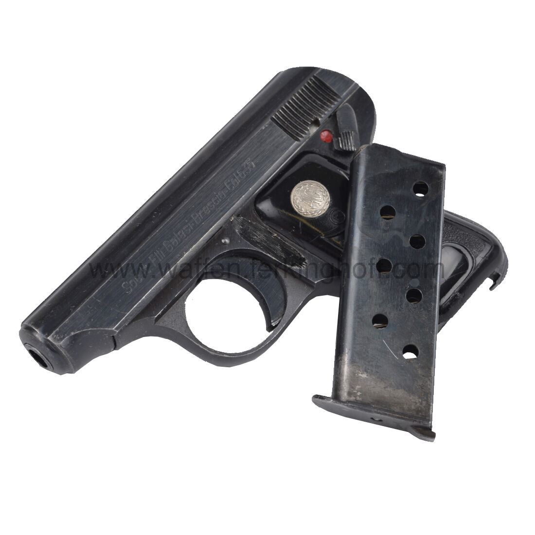 Kaliber 6,35mmBrowning, ha.Pistole Armi-Galesi Brescia Italy Modell Brevetta Mod.9, Lauflänge 6cm/2,36", schwarz brüniert, mit 1/einem Magazin 7 Patronen, Codierung XXV, Original Beschuss Brescia Italien, Waffennummer auf Schlitten statt Griffstück, Cal. 6,35 auf Schlitten statt Brevetta Mod.9, Markierungen auf Griffstück links entfernt, Gebraucht- und Sammlerwaffe Erhaltung 2.