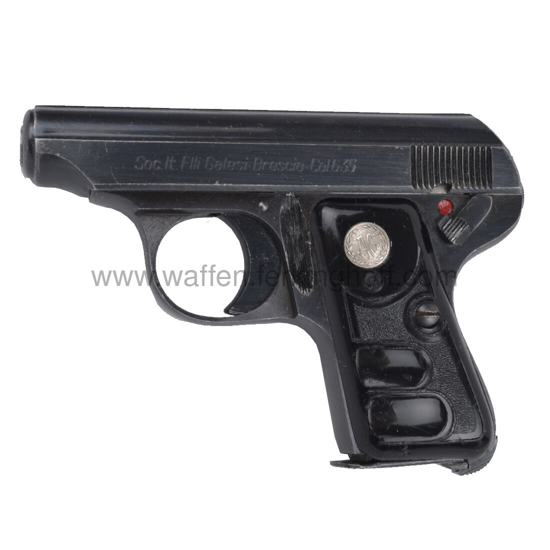 Caliber 6.35mmBrowning, se.Pistol Armi-Galesi Brescia Italy Model Brevetta Mod.9 Black, barrel length 6cm/2.36", with 1/one magazine 7 rounds, Code XXV, Original Proof Test Brescia Italy, serial number on the slide instead of frame, Cal. 6.35 on the slide instead of Brevetta Mod.9, markings on frame left removed, Used and Collector Gun Condition 2.