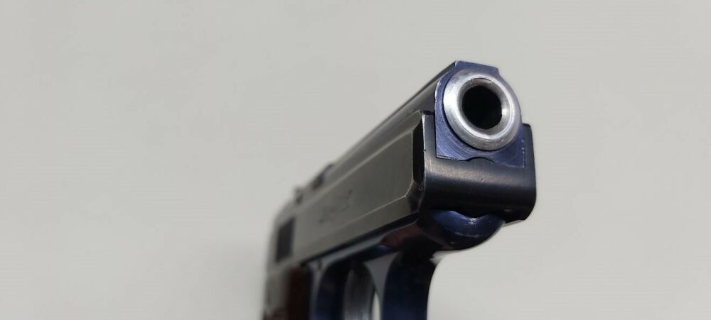 Taschenpistole mit gebläutem Dural-Griffstück , der 6 cm lange Lauf ist innen spiegelblank , Single-Action Abzug , Hahn und Abzug sind vernickelt , die originale Bläuung ist am mehreren Stellen leicht... ...weiterlesen