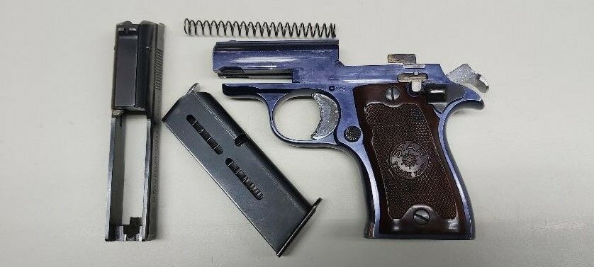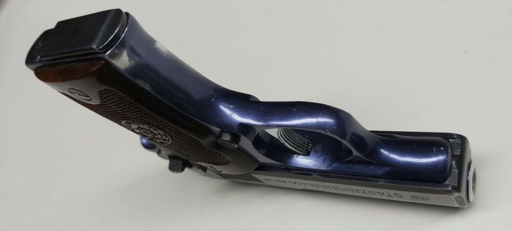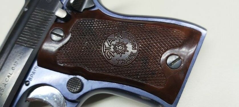 Taschenpistole mit gebläutem Dural-Griffstück , der 6 cm lange Lauf ist innen spiegelblank , Single-Action Abzug , Hahn und Abzug sind vernickelt , die originale Bläuung ist am mehreren Stellen leicht berieben , originale Kunststoffgriffschalen , Magazinkapazität 8 Patronen , feste Visierung , Visierlänge 8,5 cm , Gesamtlänge 12,5 cm , Höhe 9,5 cm , Spanischer Beschuß