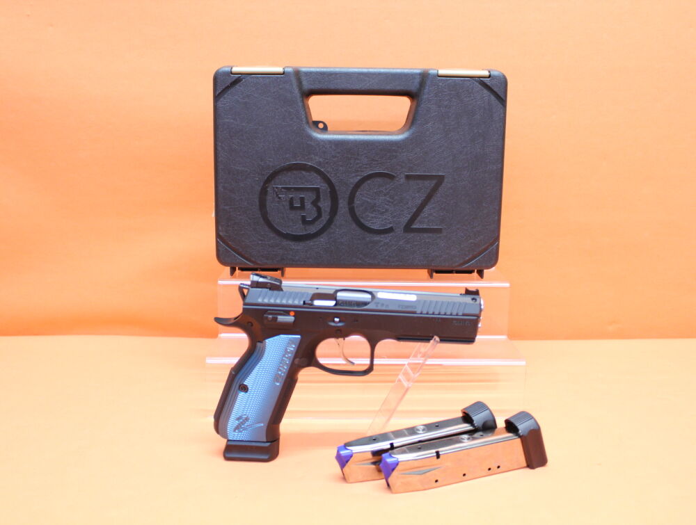 System CZ 75, 119mm Lauf, Fiber-Leuchtkorn, höhenverstellbare Visierung, Verschluss mit Barrel Bushing (Laufführungsbuchse), Griffstück mit langem Dustcover und Zubehörschiene (Weaver), vergrößerter Schlittenfanghebel, beidseitiger Sicherungshebel, verlängerter Magazinhalter, DA/SA Abzug (OHNE Schlagbolzensicherung), blaue Aluminium-Griffschalen, 19-Schuß Magazin (0424-0741-ZD21001). Incl. 2 Stück Reservemagazine/ Putzstock/ Putzbürste/ Ersatzpuffer. Kunststoffkoffer als Transportverpackung.