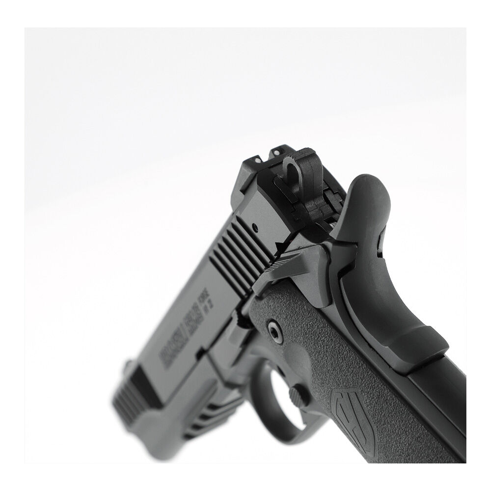 In der Zielaufnahme profitieren Schützen von einer übersichtlichen Dreipunktvisierung mit Kontrastpunkten und einer driftbaren Kimme, die durch ihre flache Bauweise ohne senkrecht herausragendes Kimmenblatt das sichere Ziehen der Forge unterstützt. Die aufgeschraubten Santoprene-Griffschalen sind rutschfest und entsprechen dem 1911-Standard. Zur Personalisierung des Schießerlebnisses können sie mit den unzähligen Optionen der 1911-Griffschalen vom Zubehörmarkt ersetzt werden. Ebenso erlaubt die Picatinny-Schiene die Aufnahme verschiedenen Zubehörs zur weiteren Anpassung an die individuellen persönlichen Bedürfnisse.