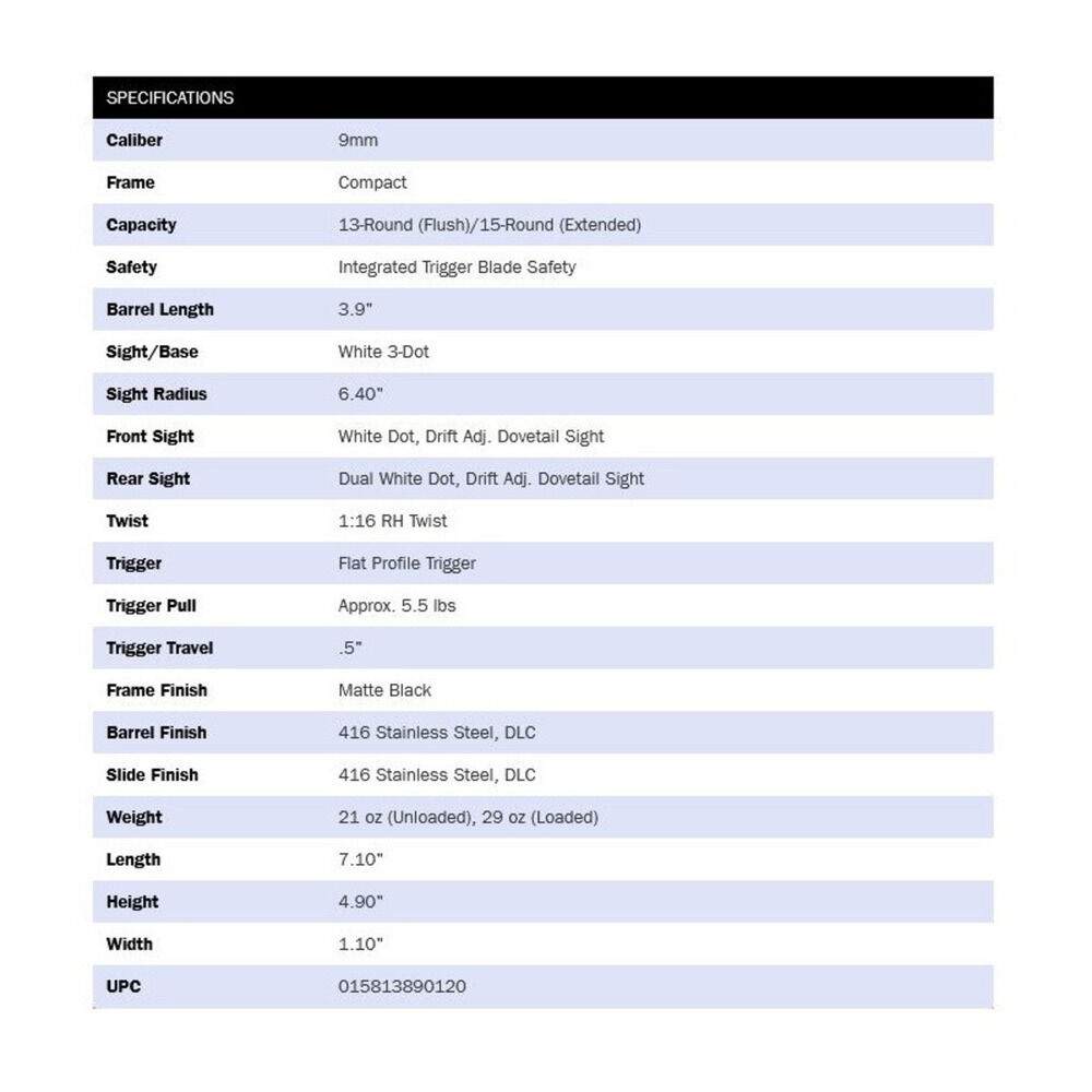 Kaliber 9mmLuger, ha.Pistole Modell MC2c Compact schwarz brüniert matt 13+1(15+1) Patronen, Lauflänge 3,9"/9,9cm, Visierung 3-Dot weiß fix, Abzugssicherung, Abzugsgewicht ungefähr bei 5,5lbs/2.497gramm ab Werk, mit 1/einem Magazin 13 Patronen schwarz und 1/einem Magazin 15 Patronen schwarz mit Verlängerung, Gesamtgewicht 21oz/595gramm ohne Munition, Gesamtlänge 7,1"/18cm, mit Kabelschloss und Bedienungsanleitung, Code 89012 Mossberg USA. Verkauf solange vorrätig!