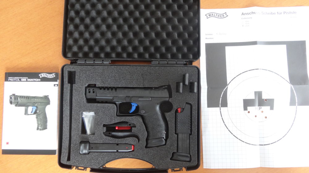 Die neue reinrassige Großkaliber-Sportpistole WALTHER Q5 Match. Abweichend von der Standard PPQ M2 5“ bekam die Q5 Match ein neues sportliches Verschluss-Design. Die Q5 Match wird ausgeliefert mit drei auswechselbaren Adapterplatten für Red-Dot-Visierungen von Trijicon, Leupold und Doctor/Meopta Q5 Match sofort erkennbar: Das blaue Züngel (nicht als Zubehör erhältlich!) und die Abzugstange mit blauer AFC-Beschichtung sorgen für eine bessere Abzugcharakteristik. Für den Wettkampfeinsatz gehören gleich drei 17-Schuss-Magazine zum Lieferumfang.