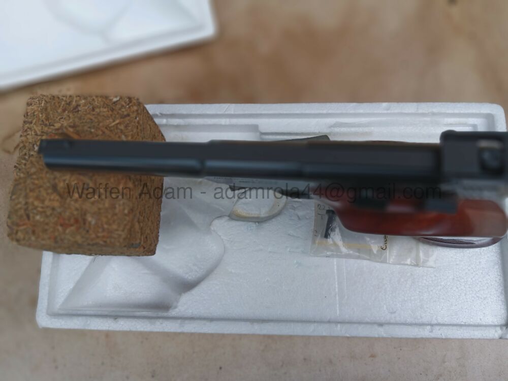 - Visier und Balkenkorn, qualitativ hochwertige Sportwaffe, Ganzstahlwaffe. Sportgriff aus Edelholz mit feiner Fischhaut. Vergoldeter Abzug. In original Box, in diesem Zustand selten zu finden.