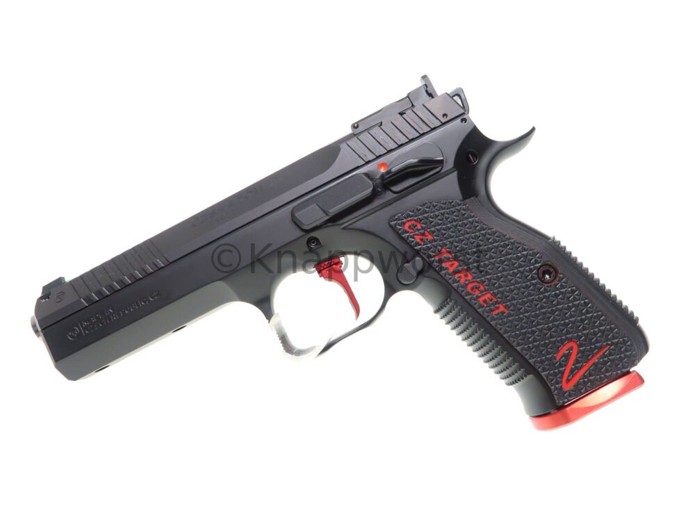 Wettkampfwaffe. Die nächste Generation der CZ 75 SP-01. Entwickelt in Zusammenarbeit mit dem CZ IPSC Team! Prägnante Merkmale sind ein verlängerter Schlitten und Lauf, verstellbare Visierung. Verstellbarer Magazinauslöser. Verkürzter Abzugsweg. Neues Oberflächenfinish. Vergrößertes Checkering am "Front- und Backstrap. High Grip Beavertail. Triangular Hammer. Blaue Aluminium Griffschalen. 19+1 Magazinkapazität.