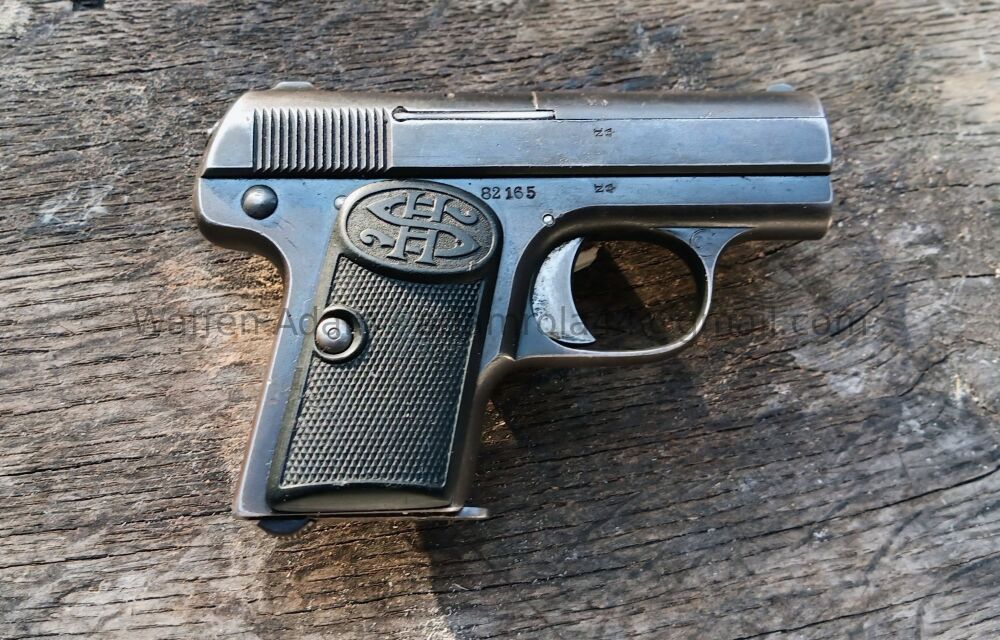 Haenel Taschenpistole, blanker Lauf, schöne Erhaltung , Signalstift, makellose Griffschalen, korrektes Magazin, Sammlerwaffe Nr 82165 gültiger Beschuss mit Krone N. Spätere Variante, mit abgesetztem Visier. Ehemalige Offizierswaffe? weiß polierter Abzug.