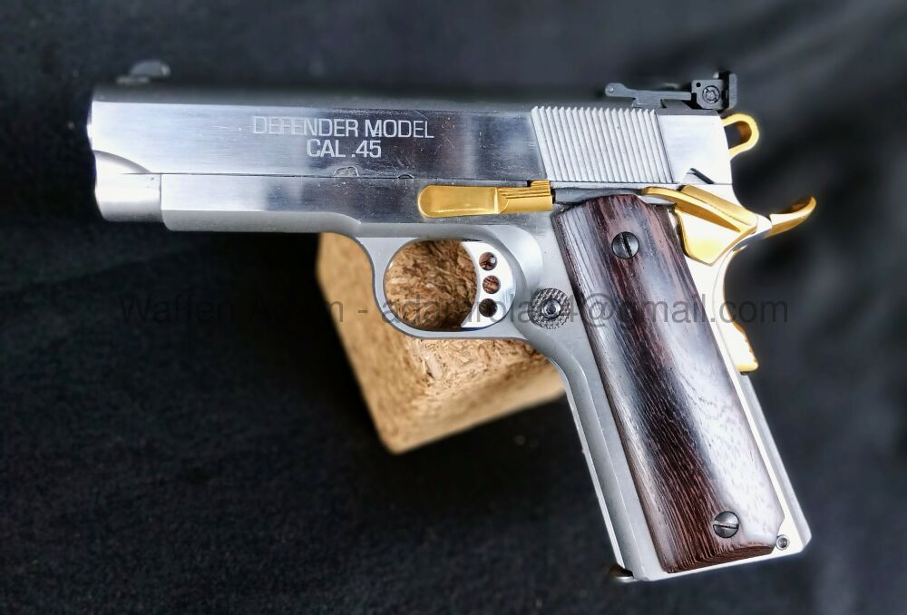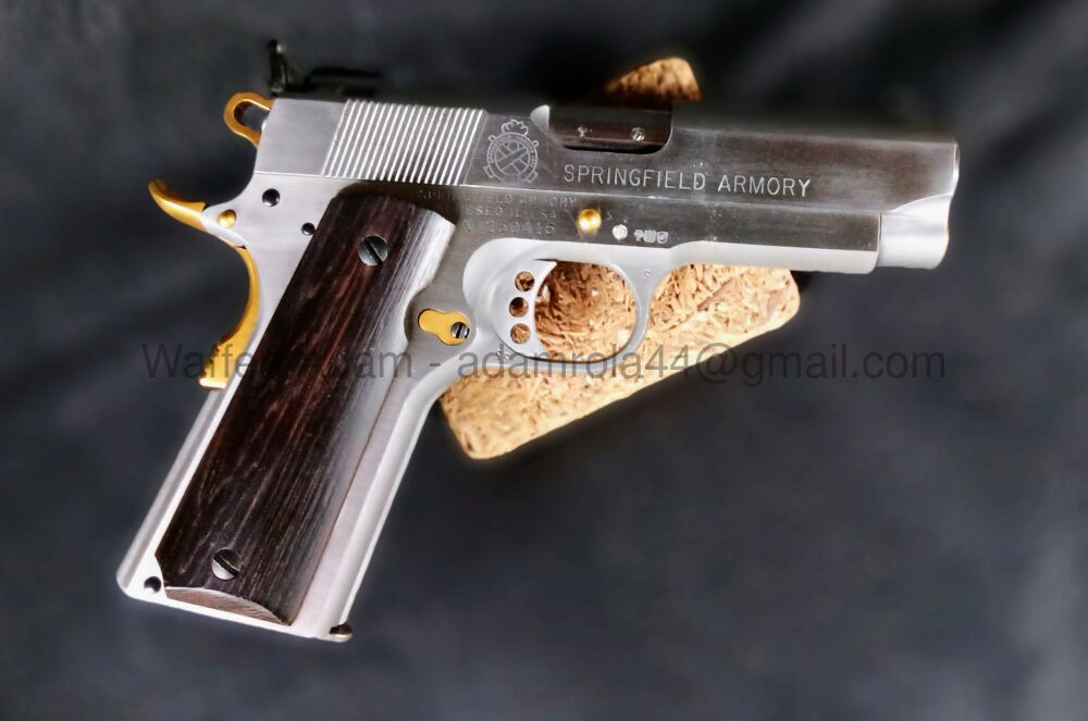 Springfield Compact 4 Zoll 1911 Pistole. Golden beschichtete Tuning Teile, Stainless Waffe. Dunkle Edelholz Griffschalen. Lauf blank. ...weiterlesen