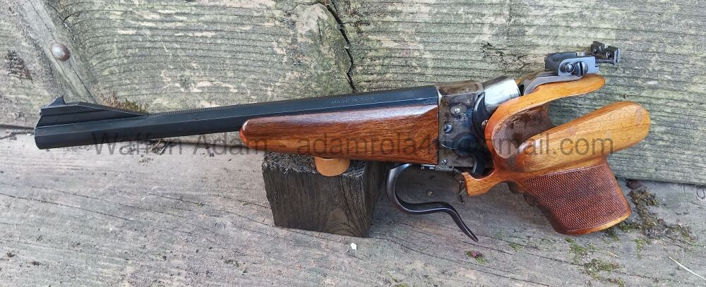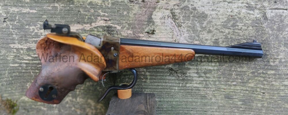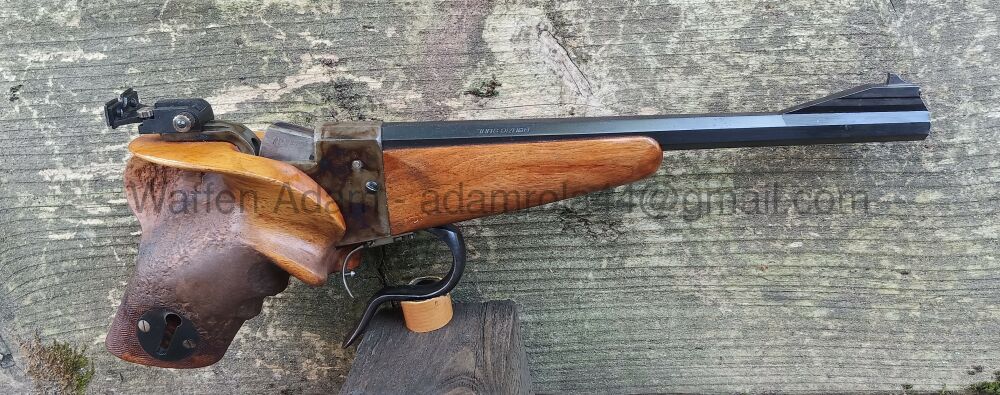 Freie Pistole BÜHAG Suhl, aus Erbschaft/ Kommission. Nussholz Griffschalen, Achtkantlauf, Bunthärtung am System. Interessante Sportpistole mit Griff vom Vorbesitzer modifiziert. Einzellader- erhältl... ...weiterlesen